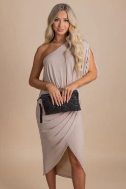 Our A Lifetime of Wishes One-Shoulder Midi Dress would be perfect for a fall date night out, wedding guest dress, or any special occasion!