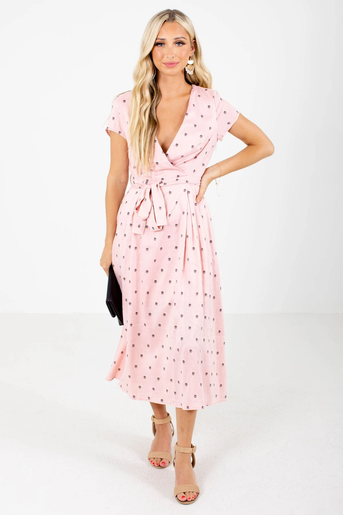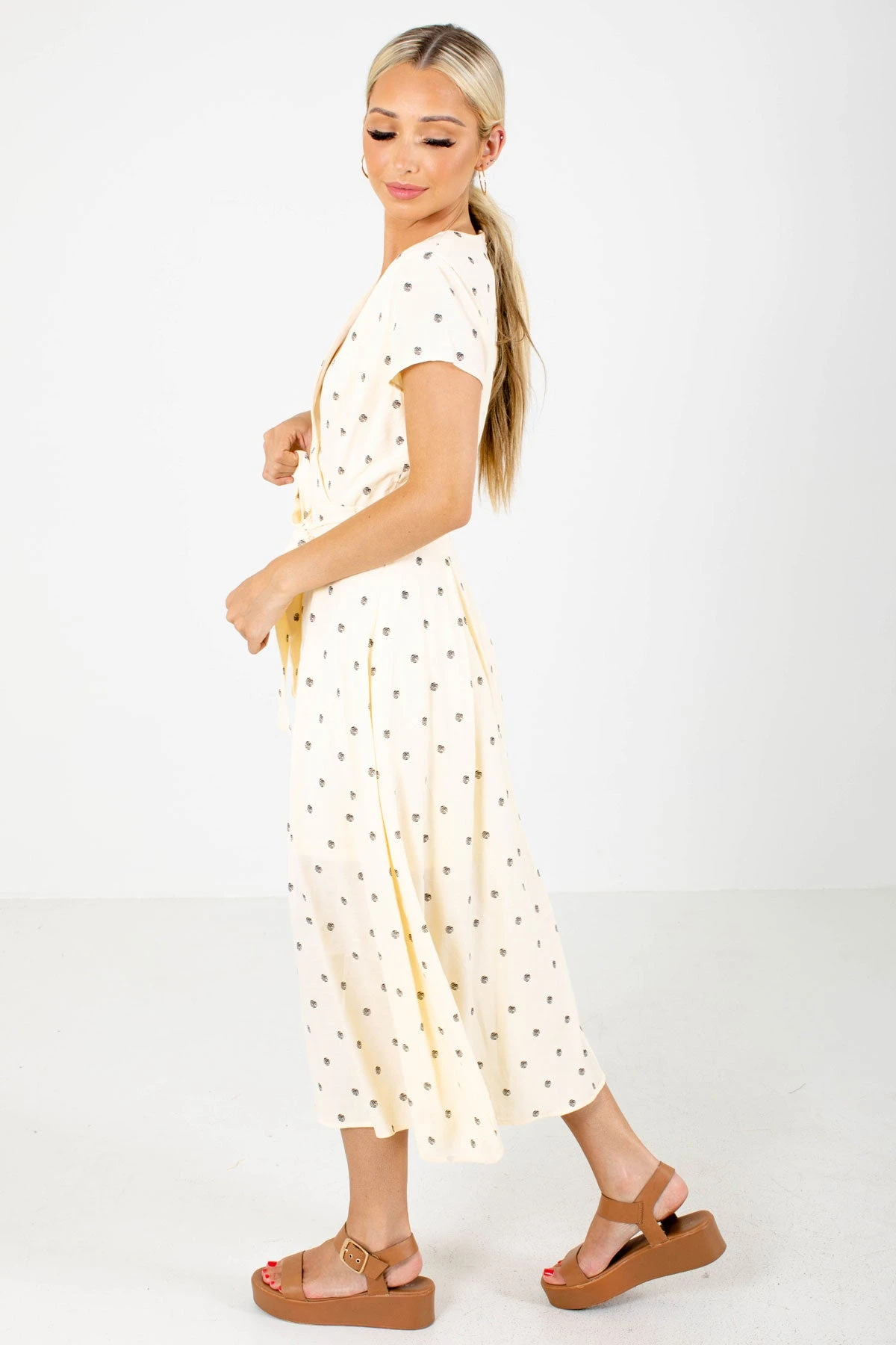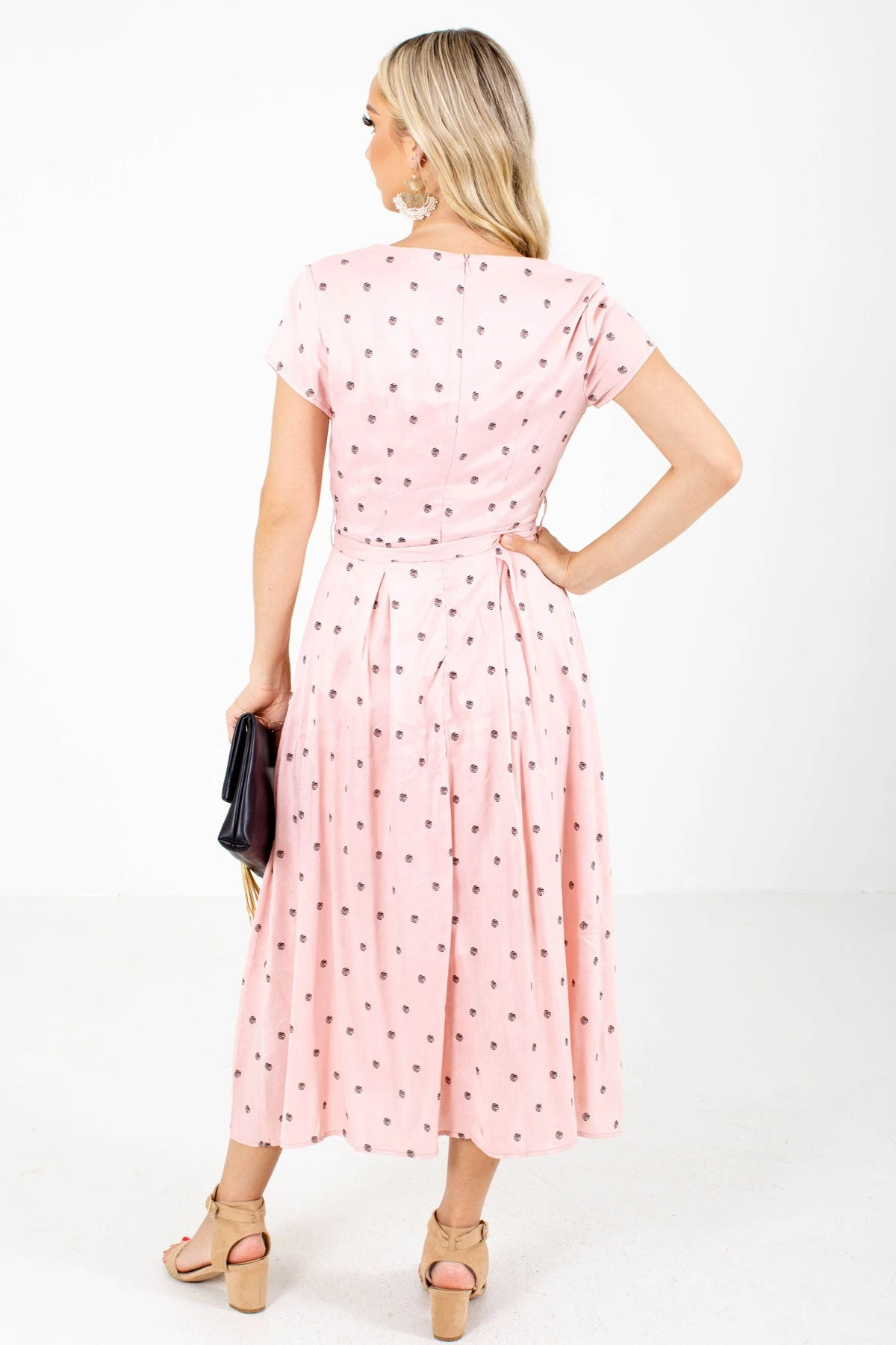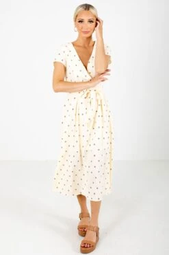You’ll look and feel adorable in our new Little Cutie Polka Dot Midi Dress! This midi length dress features a fun polka dot pattern. We’re in love with the faux wrap style, waist tie detail, and zipper back! The high-quality material and partial lining work together to make this dress comfortable and easy to wear. Pair our Little Cutie Polka Dot Midi Dress with you favorite heeled sandals to create a beautiful outfit!