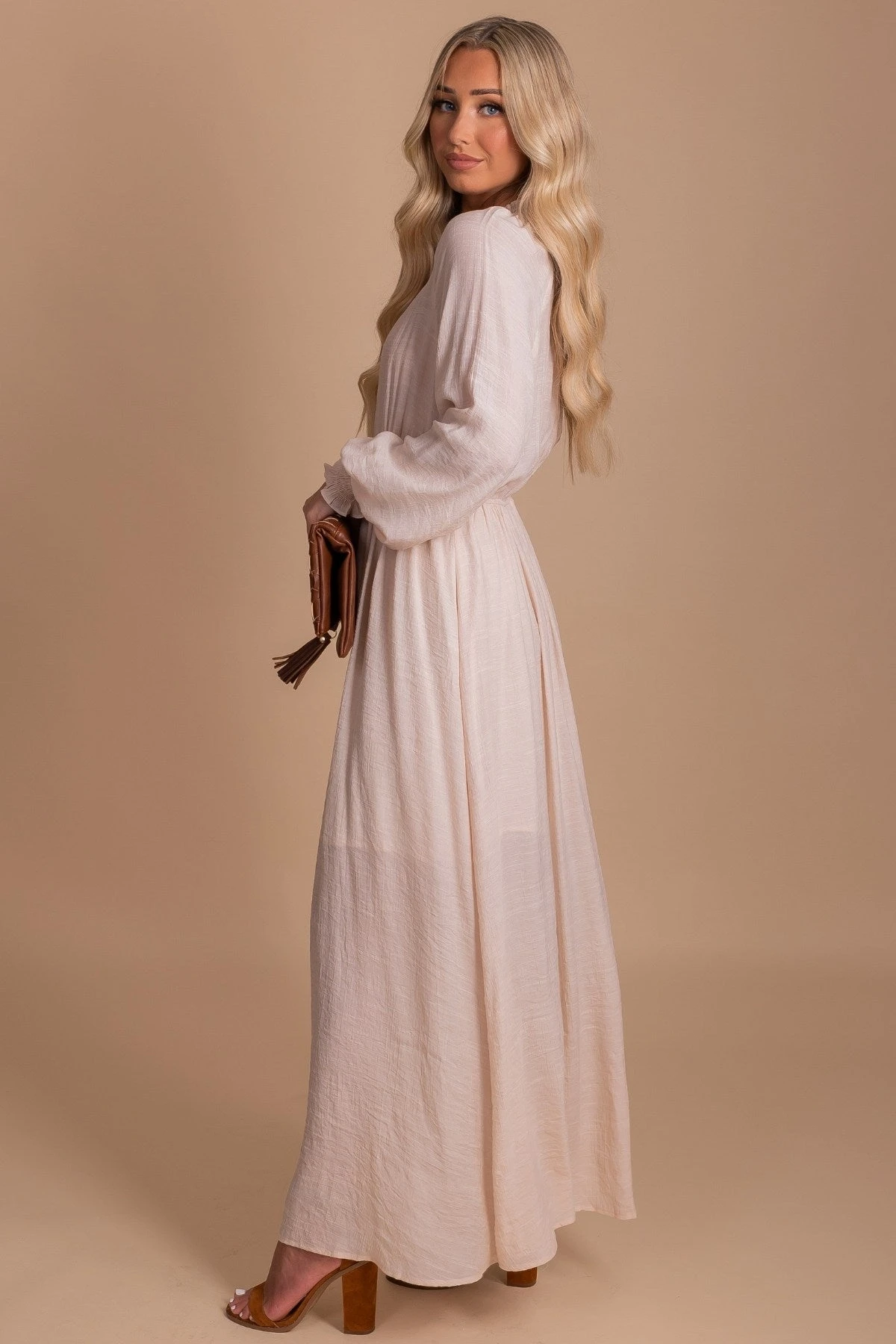 Pair the Aspire To Inspire Long Sleeve Maxi Dress with your favorite block heels and simple jewelry to look so stunning! It would be perfect to wear to a wedding, engagement photo shoot, or any other special occasion!