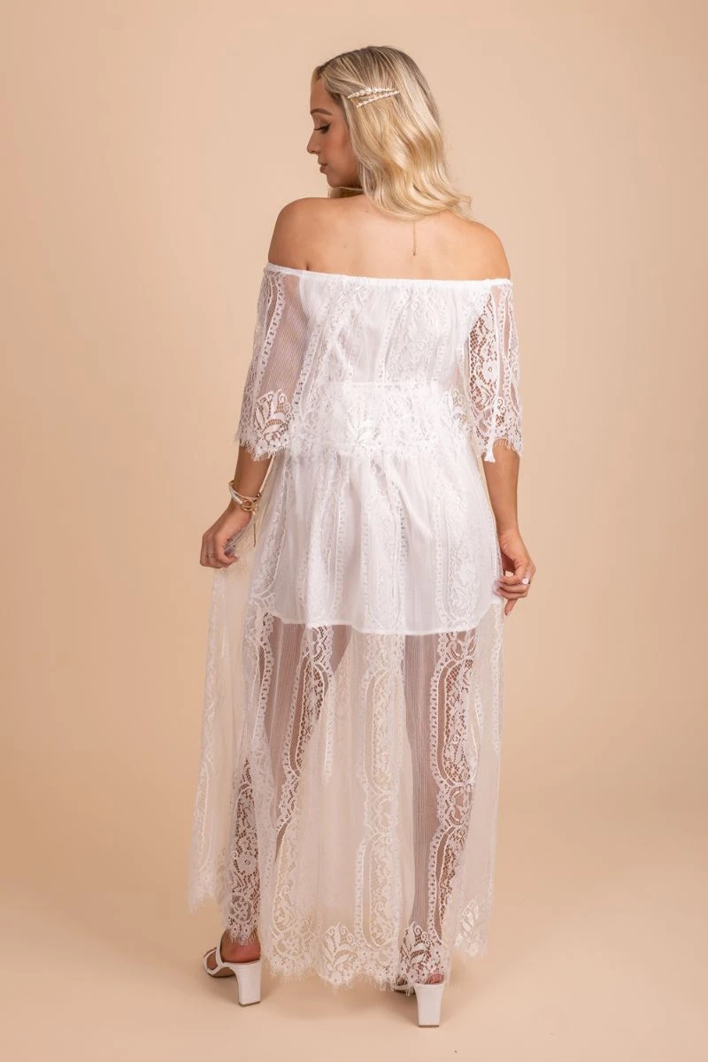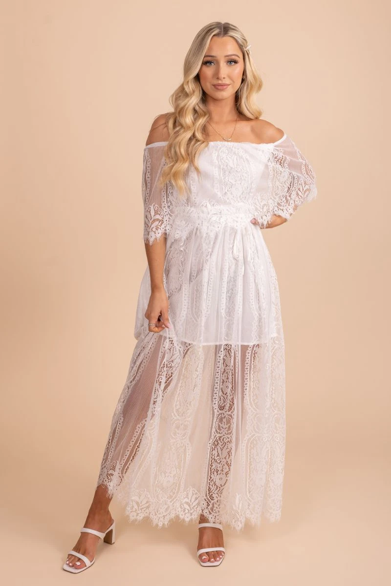 Spark some love in our Be Mine For Life Lace Maxi Dress! This gorgeous dress is white and it has stunning details. It features the cutest off the shoulder style, and a partial lining on the bust and skirt. Our favorite part of this dress is the efflorescent lace overlay which extends past the hem and sleeves, creating an ethereal, romantic look.