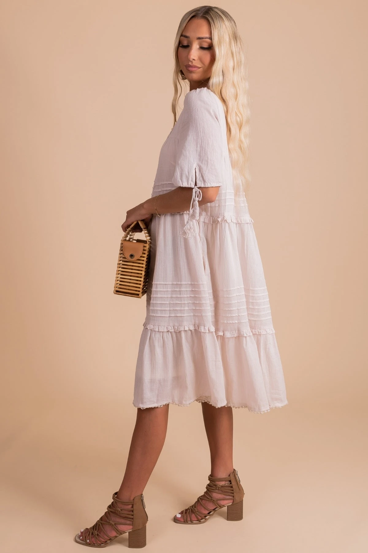 Pair our Bohemian Wonder Midi Dress with your favorite platform sandals to create a super cute outfit! This would be a perfect engagement photo dress, bridal shower dress, or everyday summer dress.