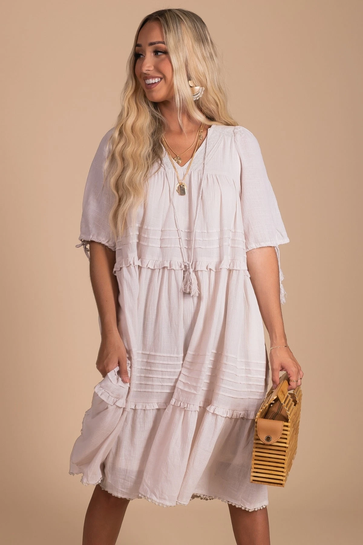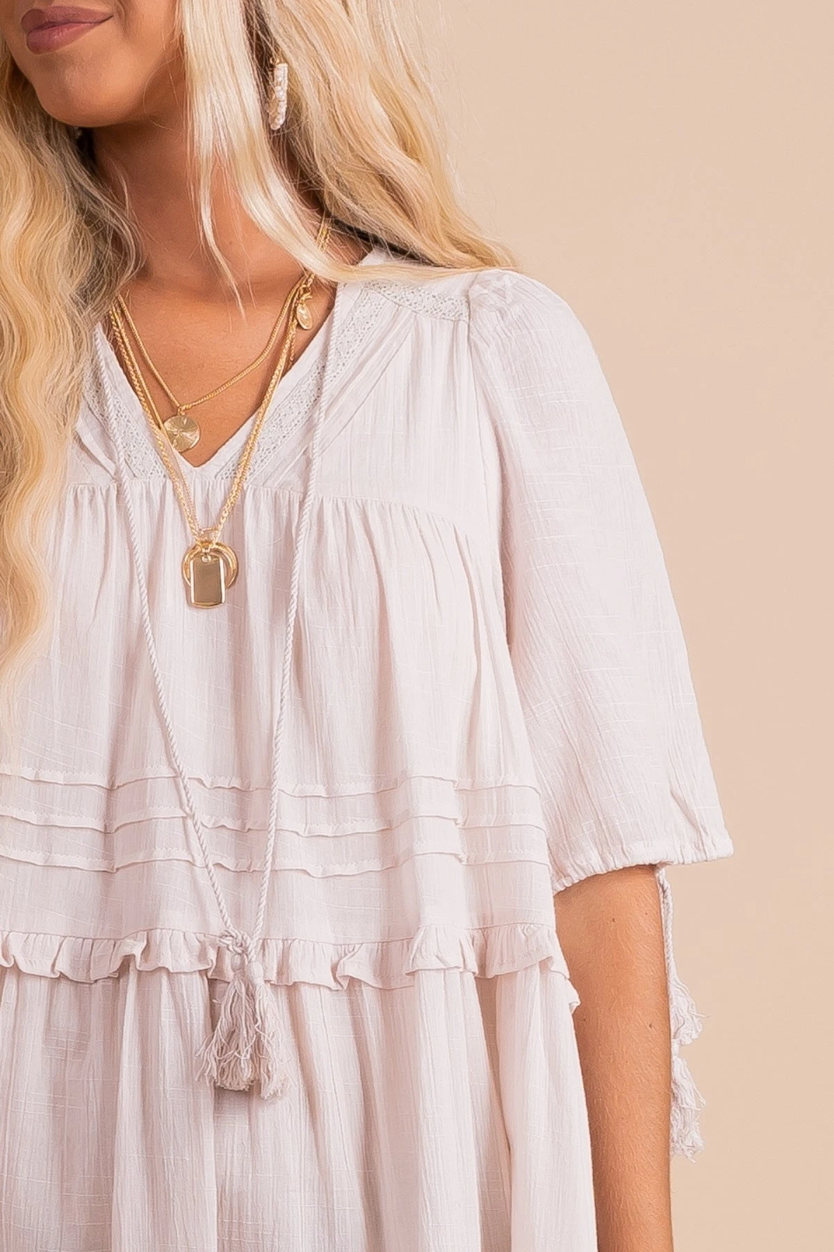 Our tent-style Bohemian Wonder Midi Dress is giving off all the boho vibes! This knee-length midi dress features a lace-trimmed v-neckline, pleated accents, tassel ties on the neckline and sleeves, and ruffled tiers. It has an interior lining that reaches just above the knee for the perfect amount of coverage. The flowy, oversized fit makes it so comfortable and boho chic!