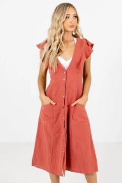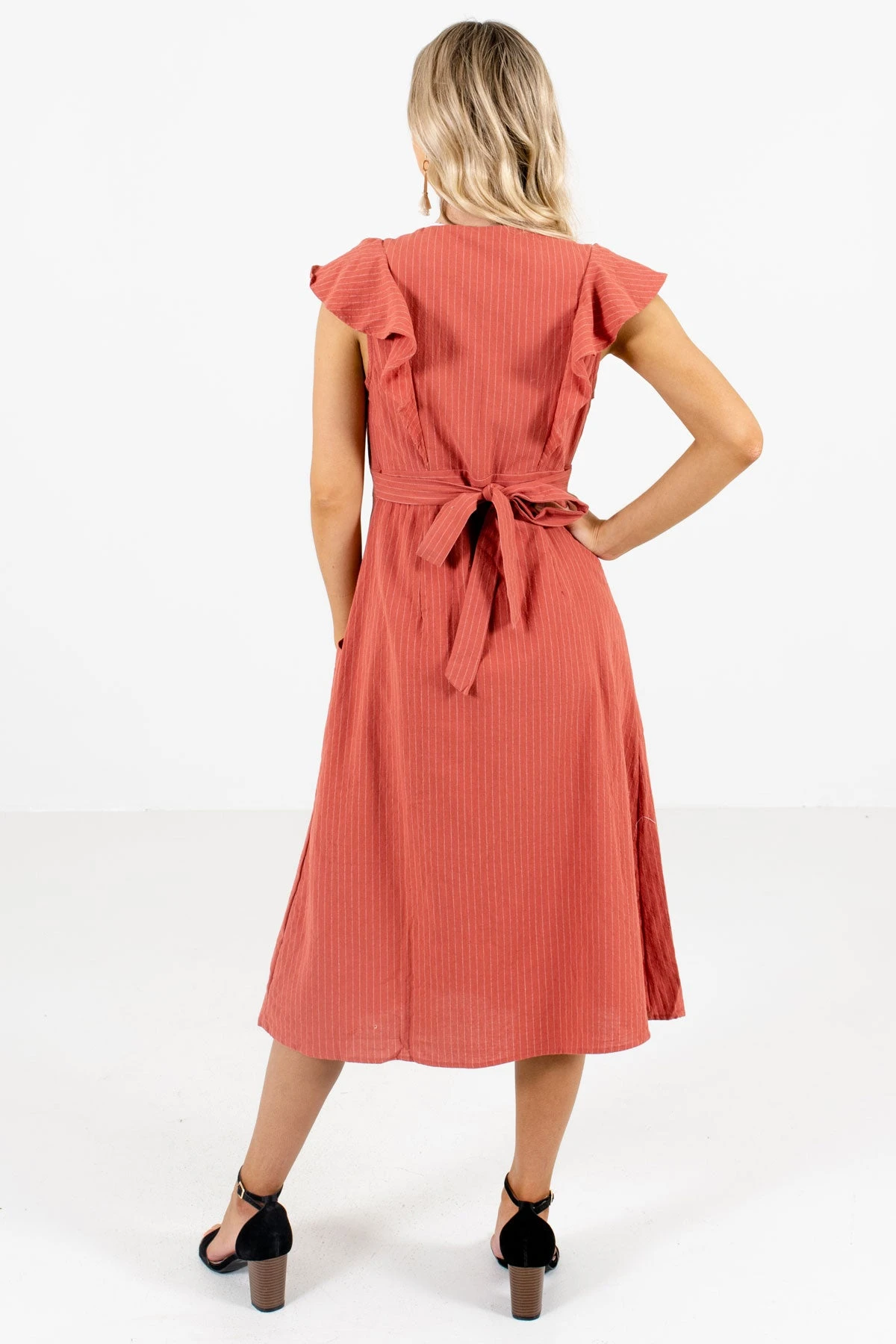We love our new Break The Rules Orange Striped Midi Dress and all of its unique details! This midi length dress is orange with a white striped pattern. It features a button-up front, waist tie detail, and pockets! The thick, high-quality material and partial lining create a comfortable fit. We’re in love with the deep v-neckline and ruffled sleeves that add a flirty finishing touch! Pair the Break The Rules Orange Striped Midi Dress with heeled sandals to create the perfect summertime look!