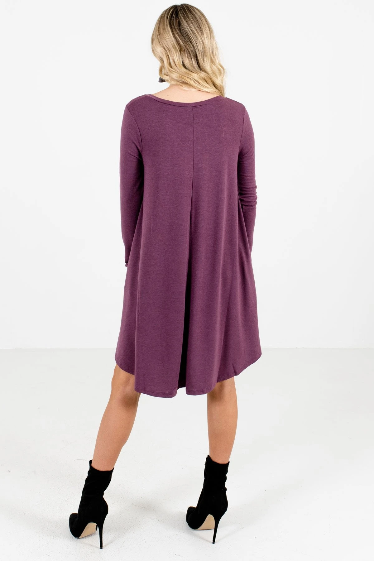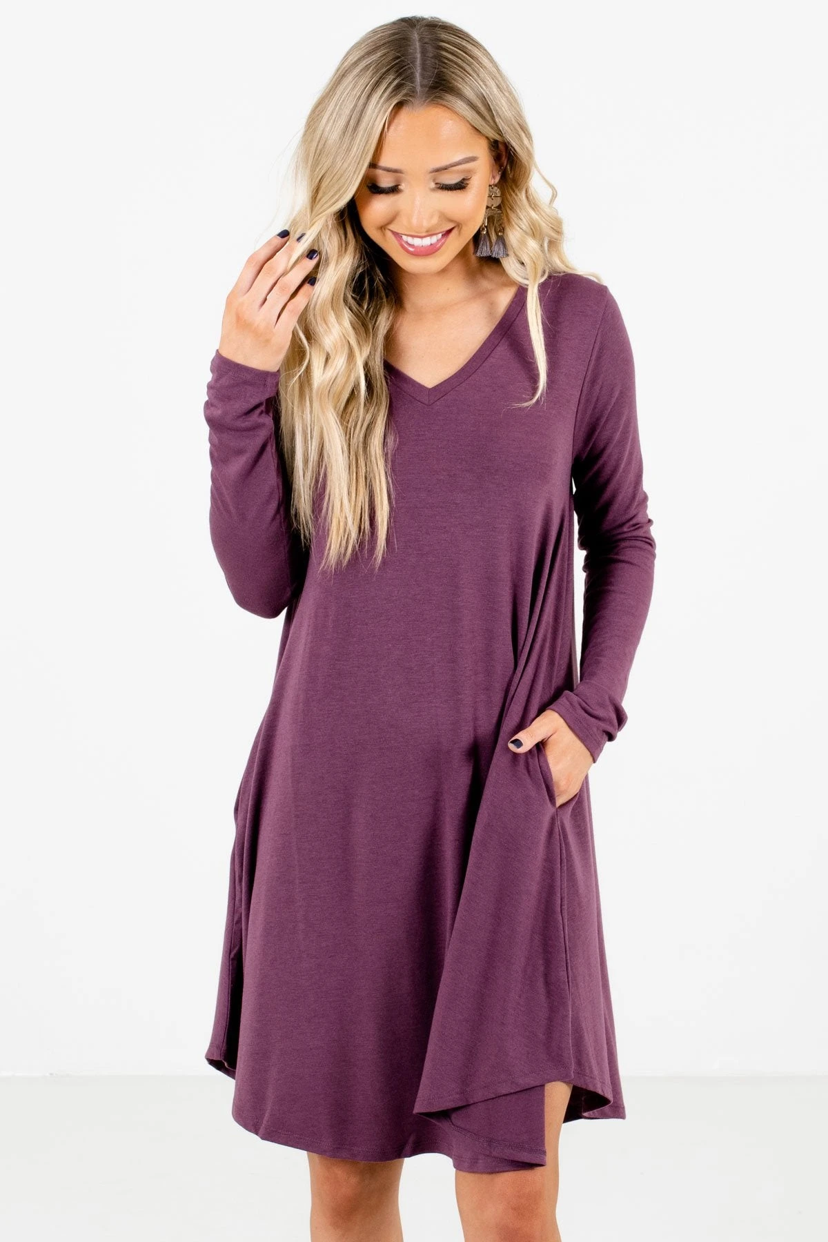 Our new Chase Your Dreams Purple Mini Dress is perfect for layering! This cute mini dress is a solid purple color that’s so fun to style and pair. It features a v-neckline, long sleeves, and pockets! We’re in love with the high-quality material that’s perfect for the upcoming season. Pair our Chase Your Dreams Purple Mini Dress with heeled black boots to recreate our model’s outfit! Try adding a cardigan on colder days.
