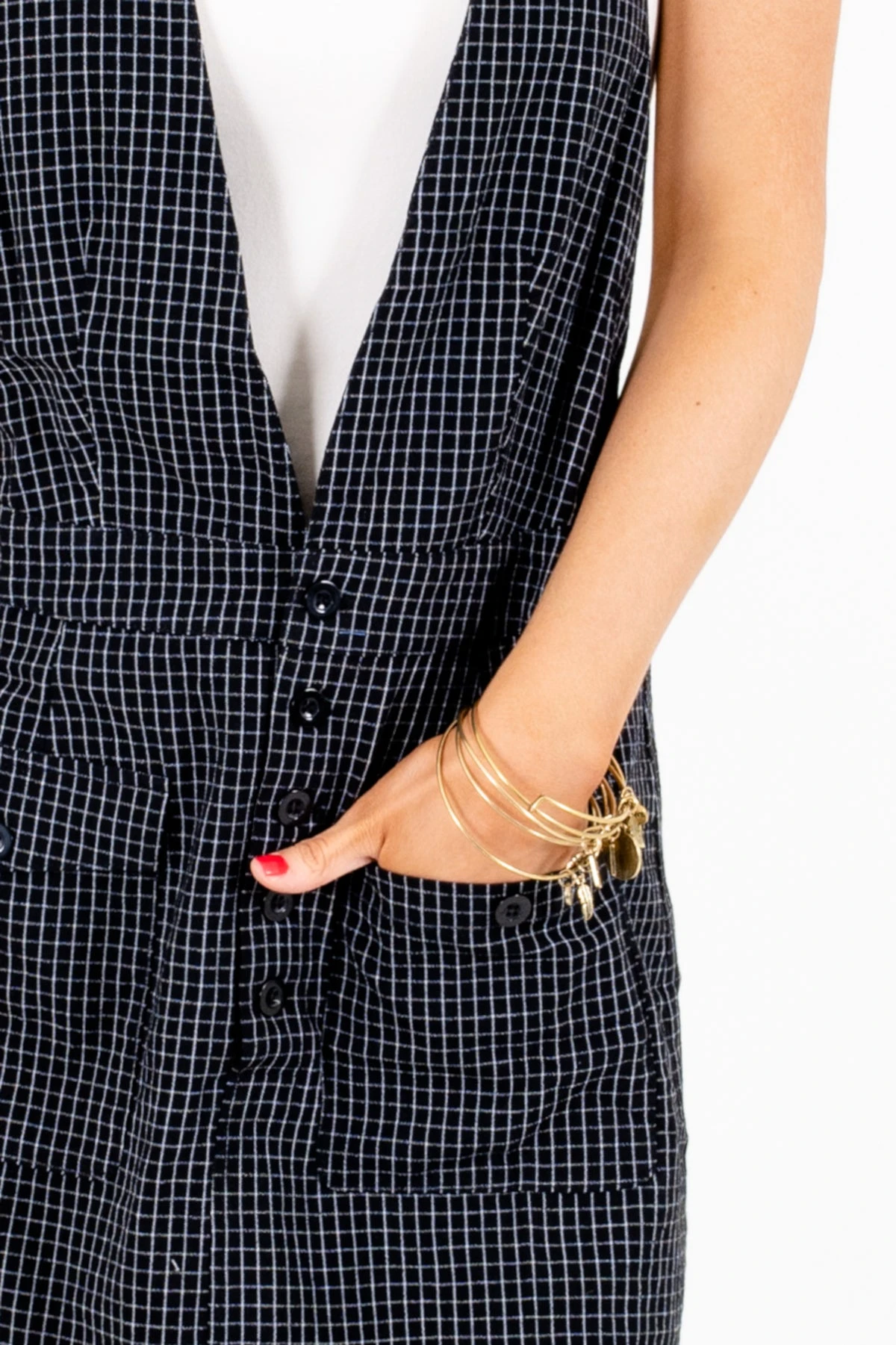 Our new Classy Gal Mini Dress is a must-have in your wardrobe! This cute mini dress features a white grid pattern. We’re in love with the trendy pinafore style! The lightweight, high-quality material makes this dress comfortable and easy to wear. The partial button-up front and pockets perfectly complete the look! Wear our Classy Gal Mini Dress over a simple white top to recreate our model’s cute outfit. Try wearing it over a graphic tee for a cool look!