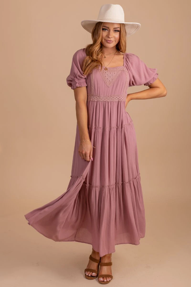 Our Effortlessly Sweet Puff Sleeve Maxi Dress is such gorgeous piece! This amazing dress features a solid dusty rose pink color, long length, and a square neckline. We’re in love with the high-quality soft material that creates a comfortable, flattering silhouette! The tiered details and floral lace accents add the perfect finishing touch! Pair our Effortlessly Sweet Puff Sleeve Maxi Dress with your favorite heels to create the perfect look for your next special event!