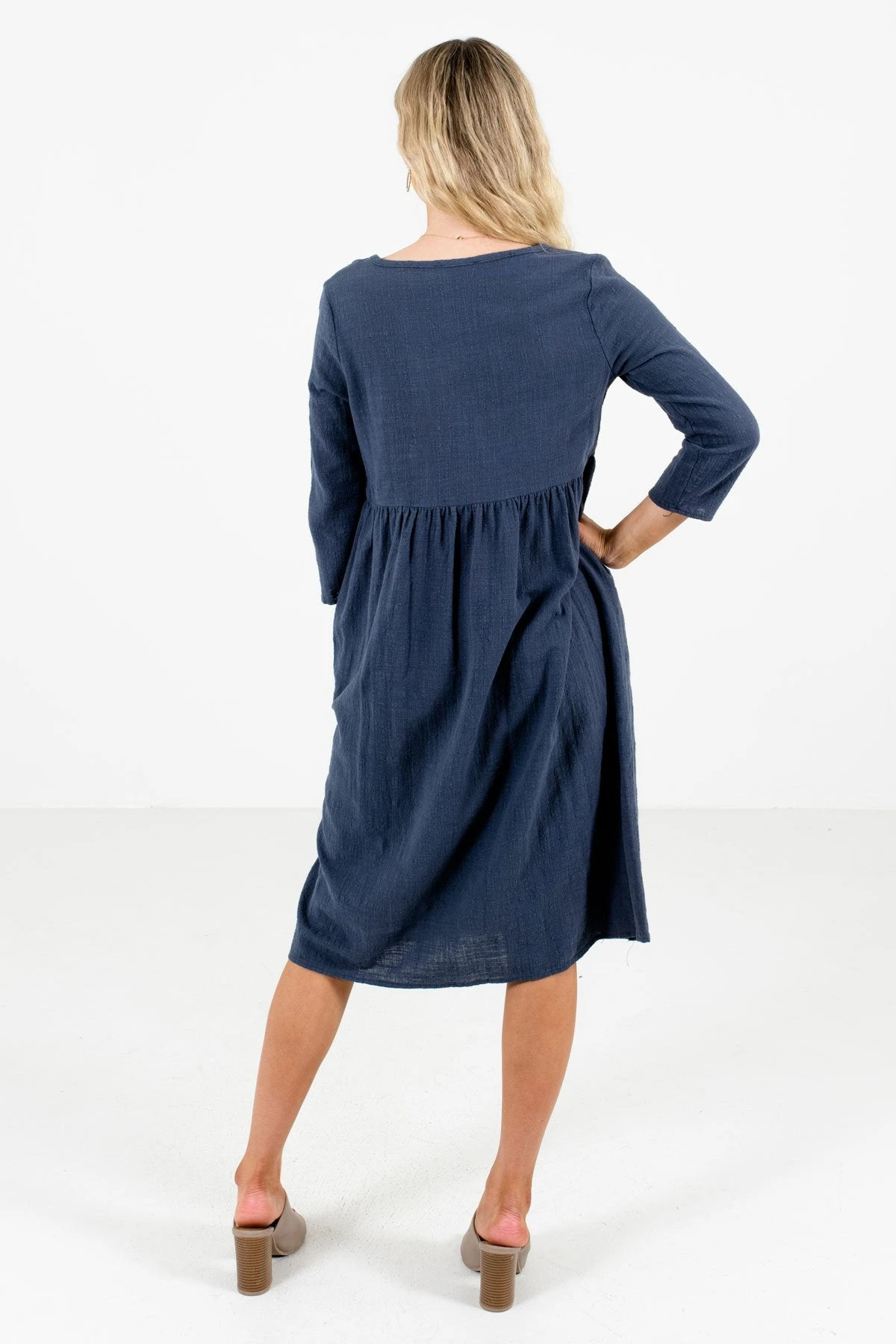 Our new Embrace Your Beauty Blue Knee-Length Dress is so comfortable and cute! This beautiful dress is a solid blue color. We’re in love with the decorative wooden buttons, 3/4 length sleeves, and pockets! The high-quality material and knee-length make it easy to wear. Pair our Embrace Your Beauty Blue Knee-Length Dress with sleek heels to recreate our model’s adorable outfit!