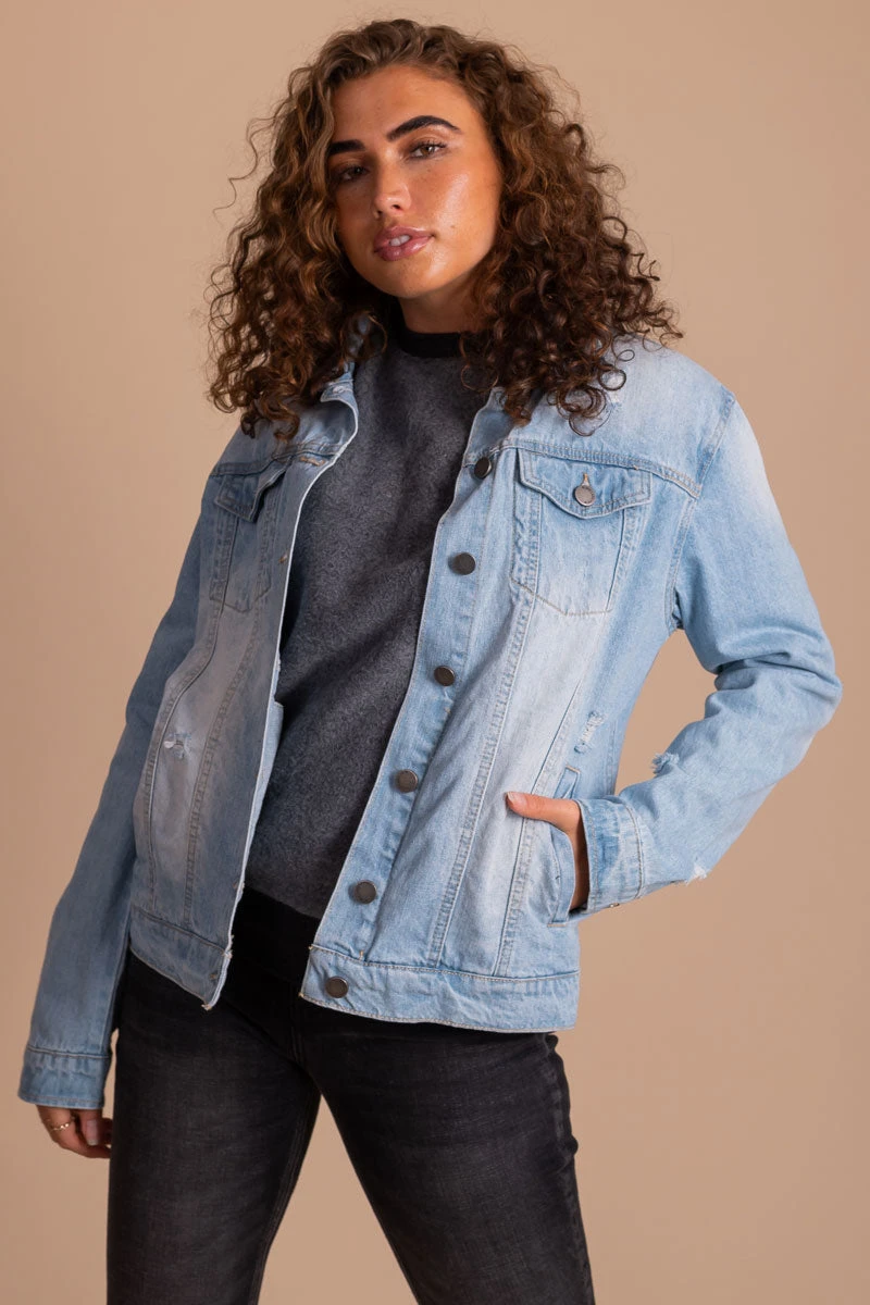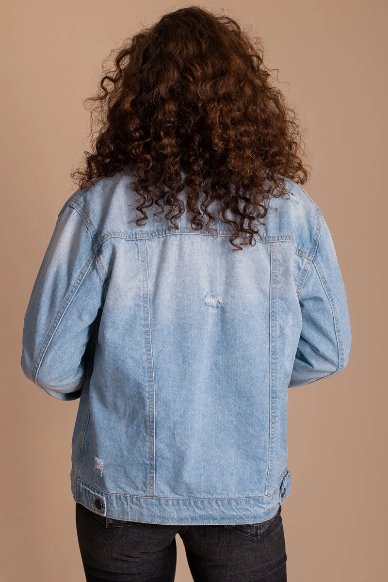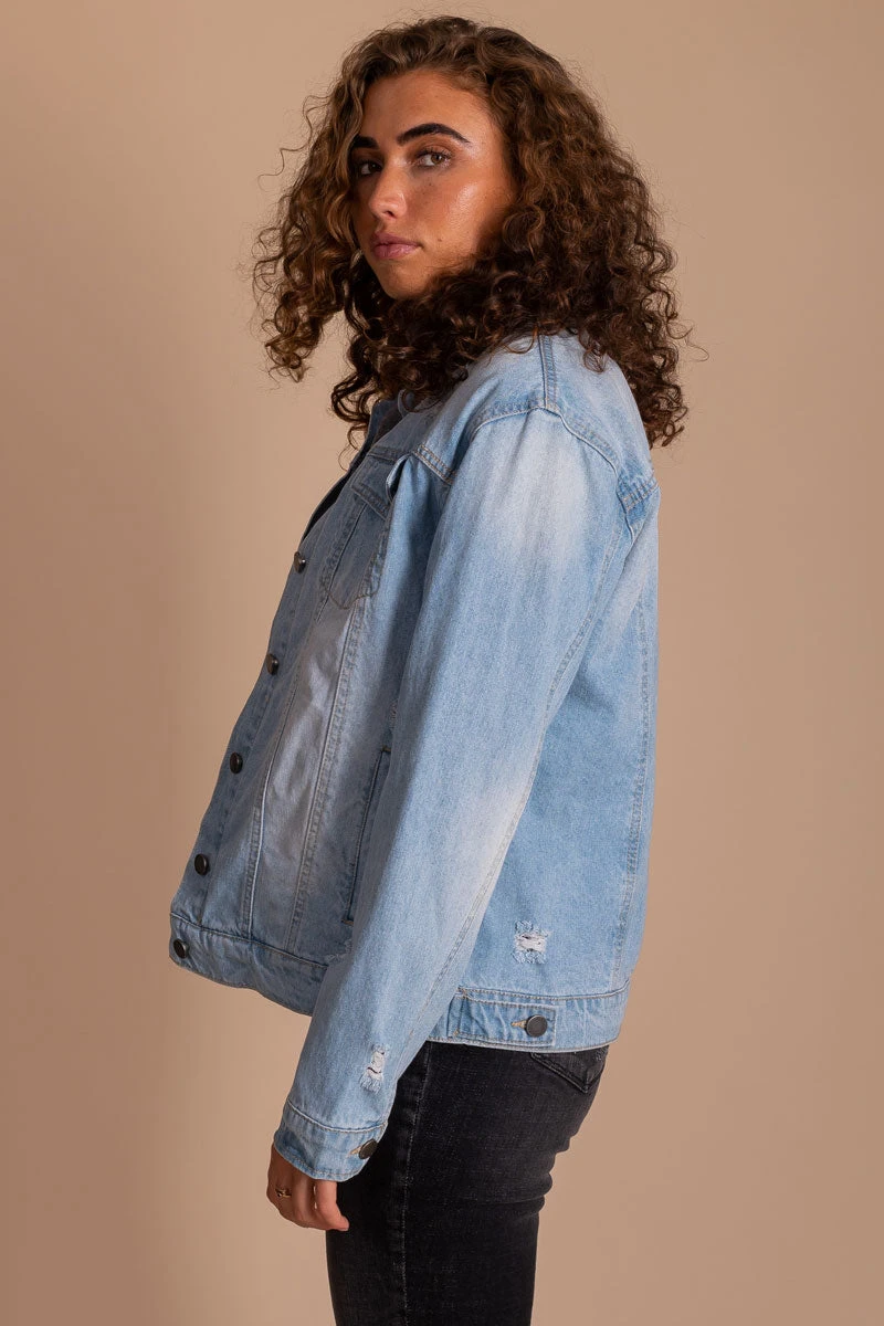 Our Fade Into View Distressed Denim Jacket would be perfect for an evening at the corn maze, a date night out, or for a back-to-school outfit!