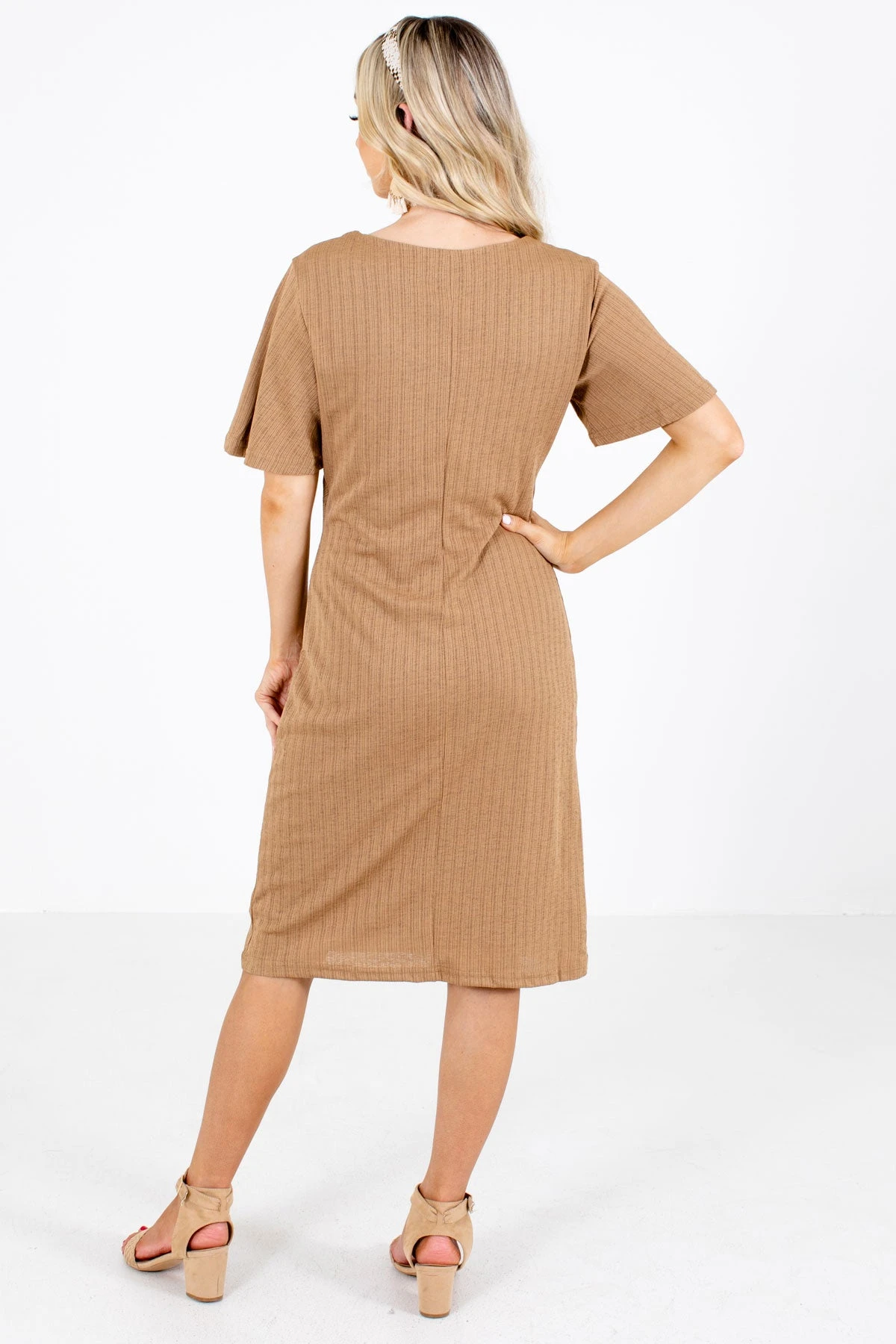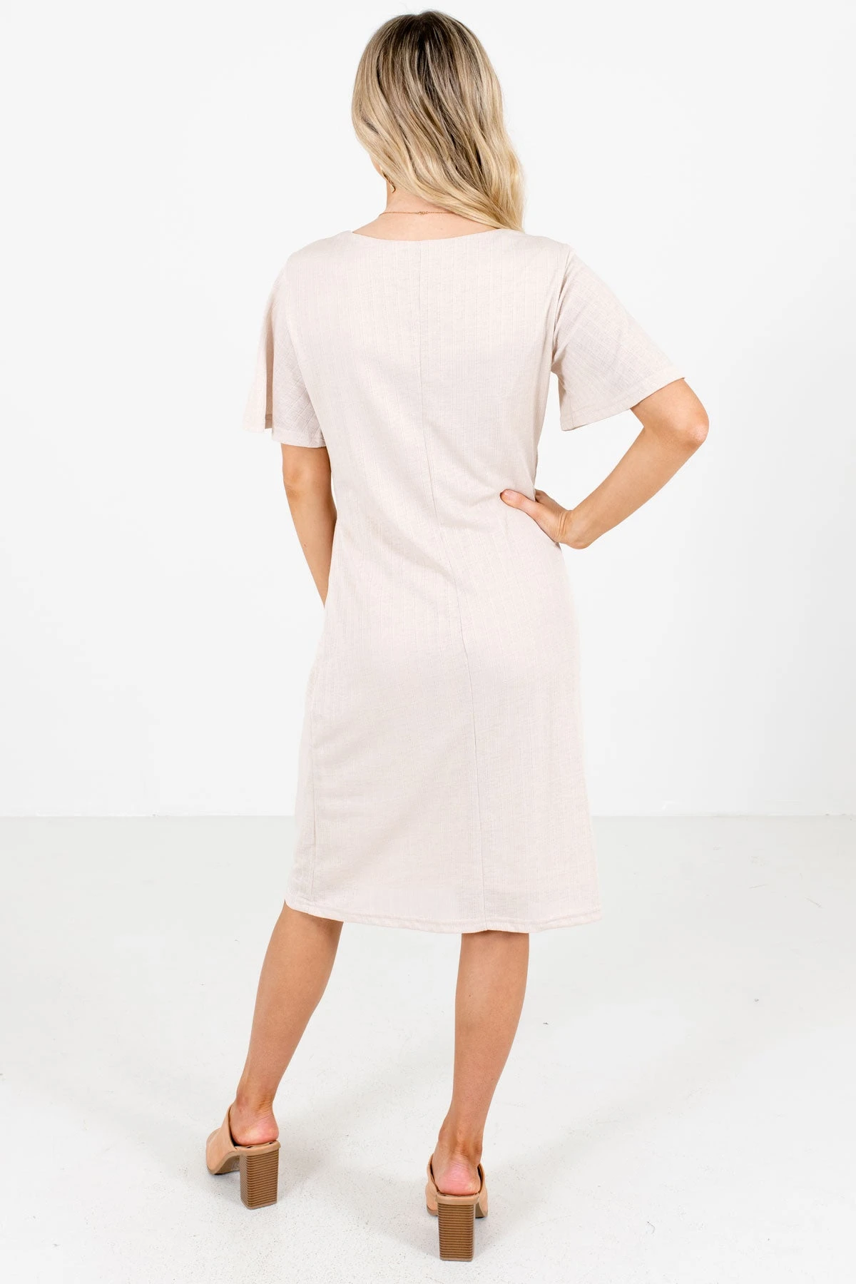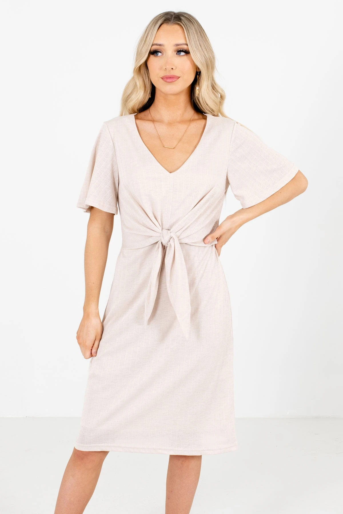 Our new Finishing Touch Knee-Length Dress can be dressed up or down for any occasion! We’re in love with the tie front detail that creates a flattering silhouette! The high-quality material and full lining perfectly complete the look. Pair our Finishing Touch Knee-Length Dress with your favorite heeled mules to create a cute business casual outfit!