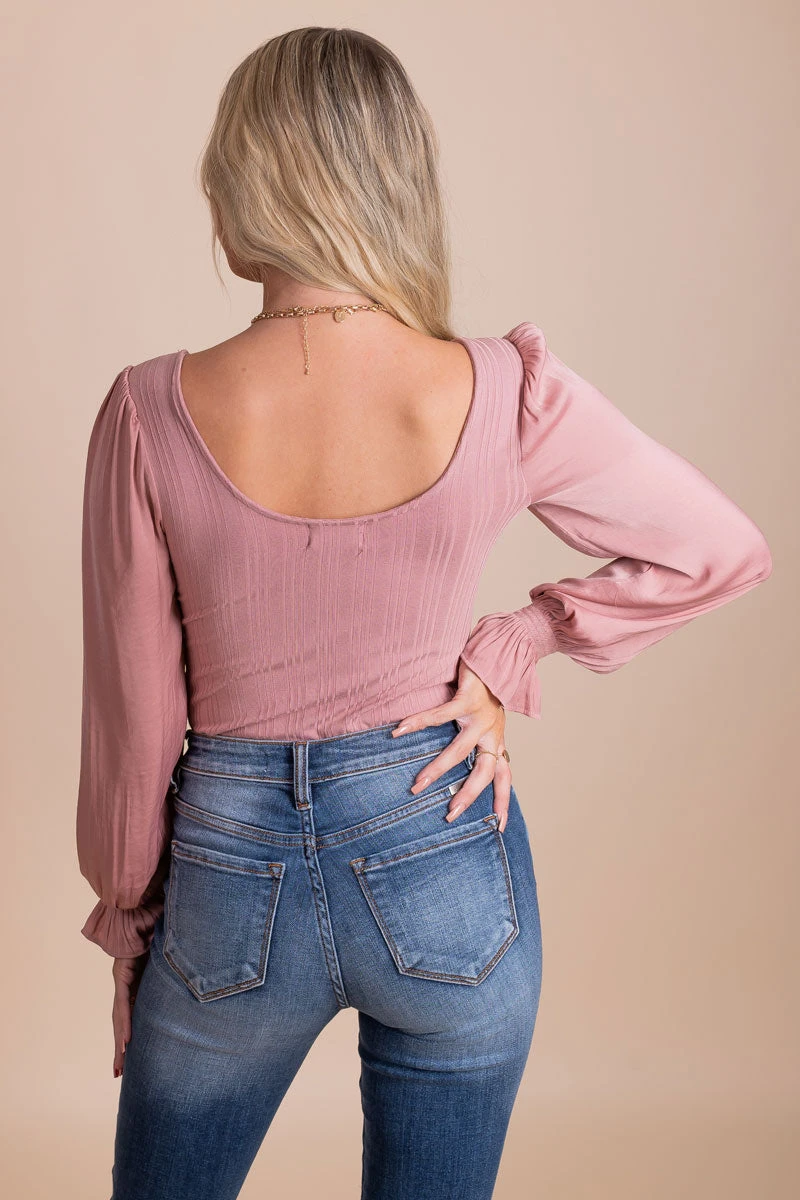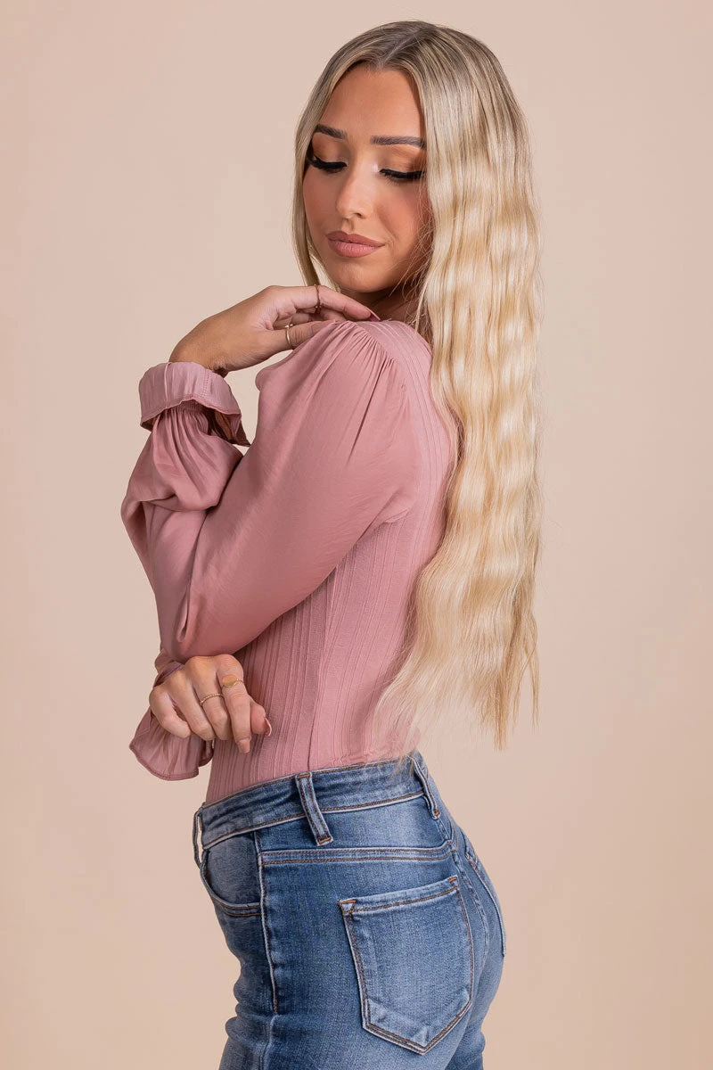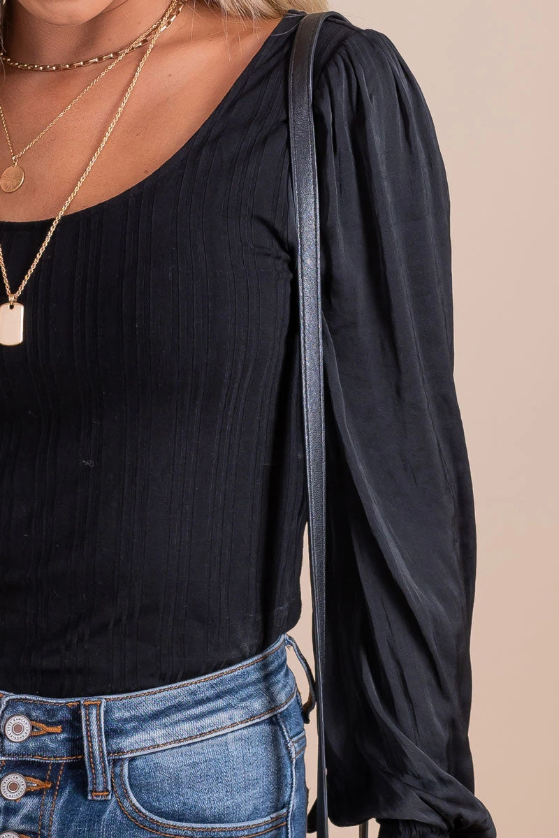 Our new First Kiss Long Sleeve Bodysuit is a fall must-have! This bodysuit features long sleeves, textured ribbed material, and two cute color options! The wide, round neckline and low back make this bodysuit so cute! Pair your First Kiss Long Sleeve Bodysuit with your favorite jeans to recreate our models outfit!