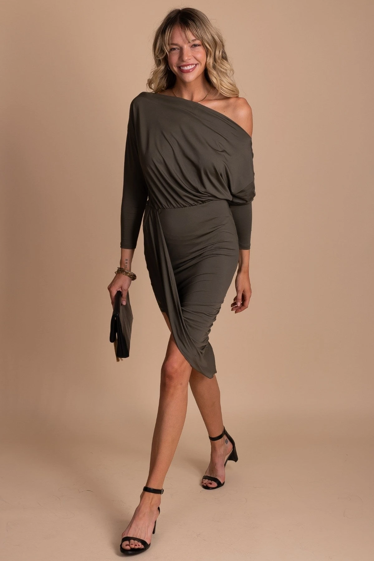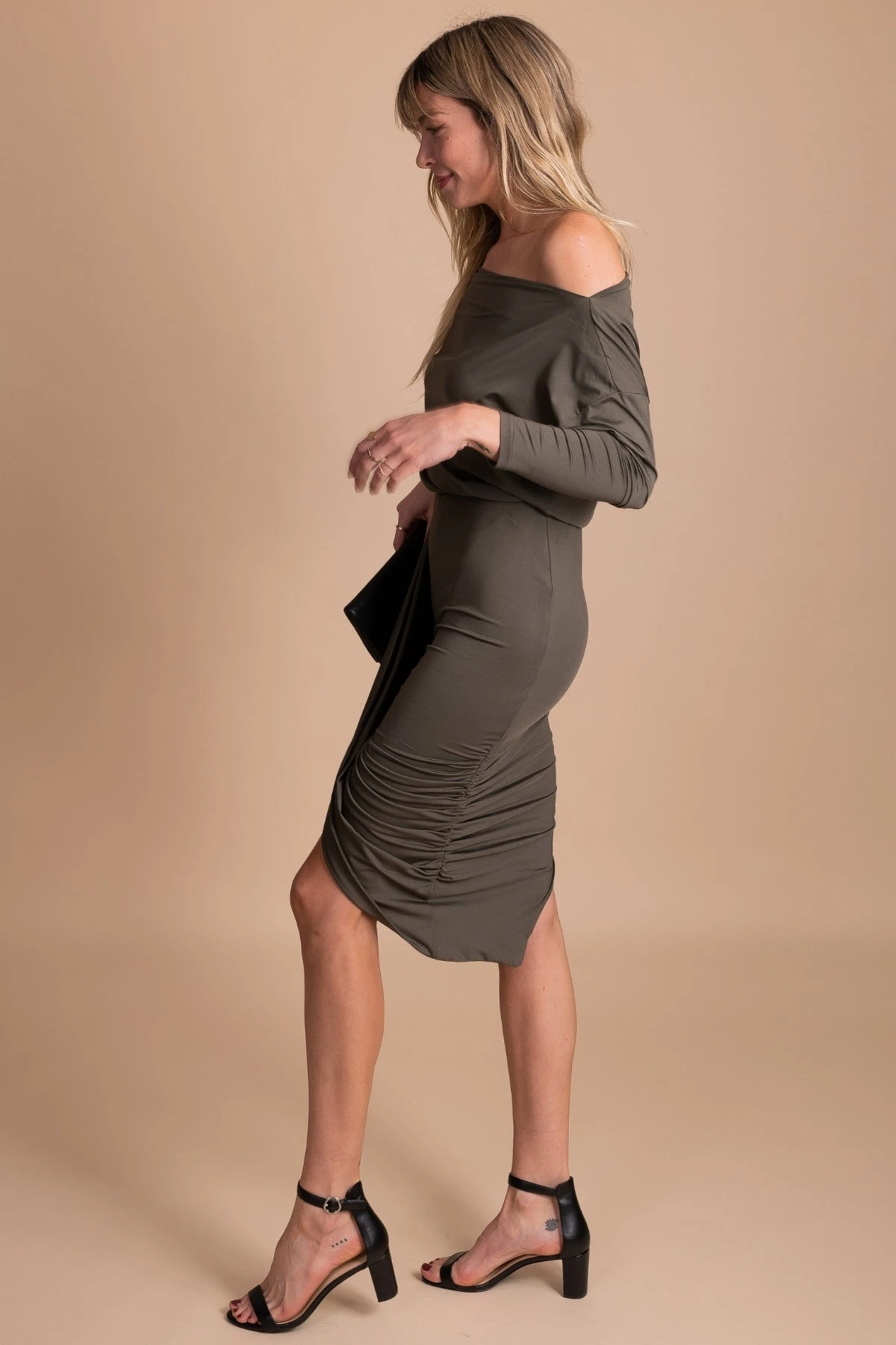 Our Going Out Tonight Bodycon Dress is so stunning! The bodycon style will accentuate your curves while the silky, stretchy material will keep you so comfortable. The ruched detailing on the skirt of the dress and off shoulder style make this dress fun for a night out or date.