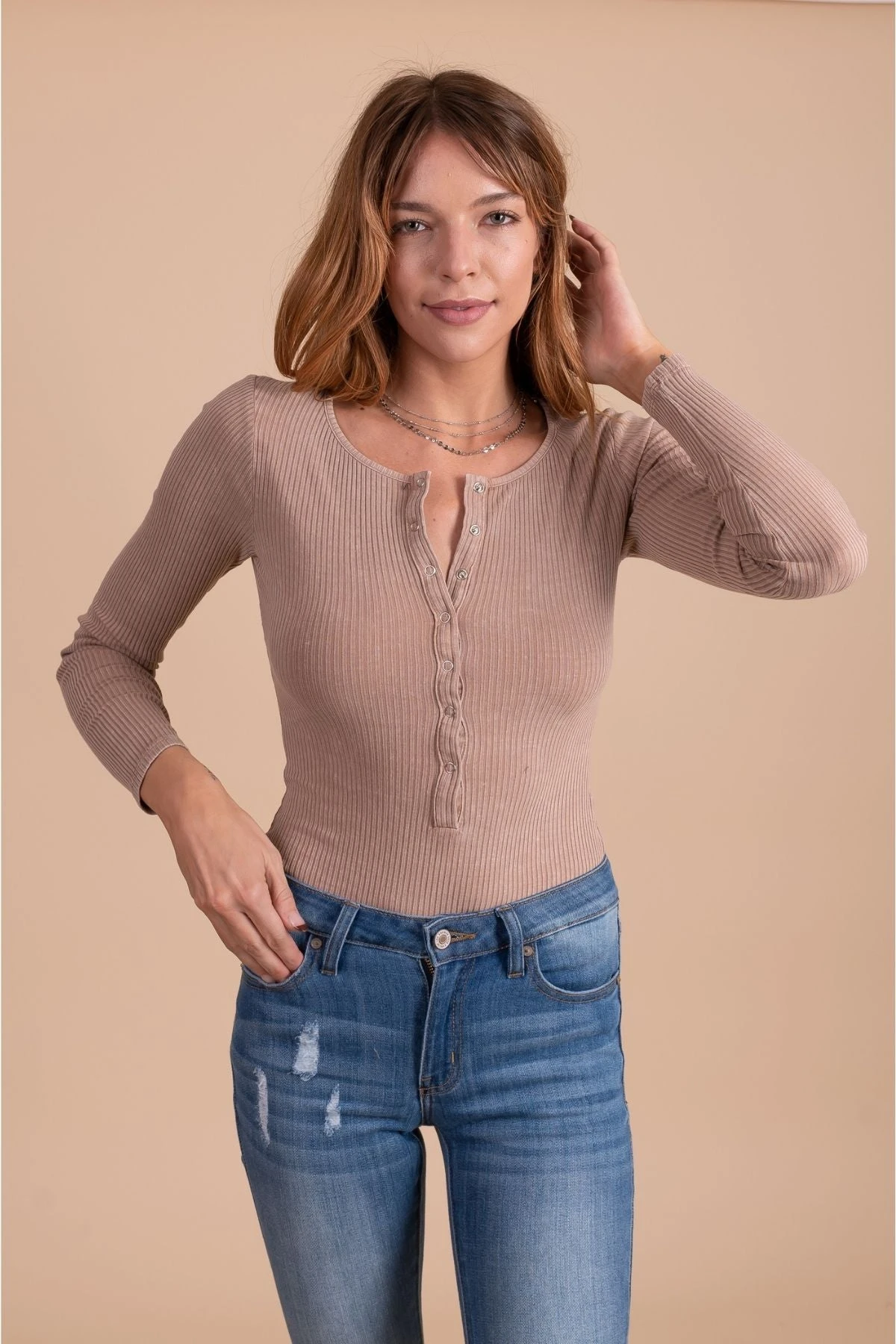Our new Happiness Guaranteed Button Down Bodysuit is a spring transitional must-have! This bodysuit features long fitted sleeves, a plush and cozy dusty pink material, and a button-down henley-inspired design. The button-down neckline and neutral color make this bodysuit so versatile! Pair your Happiness Guaranteed Button Down Bodysuit with your favorite distressed jeans to create a transitional all-season outfit!