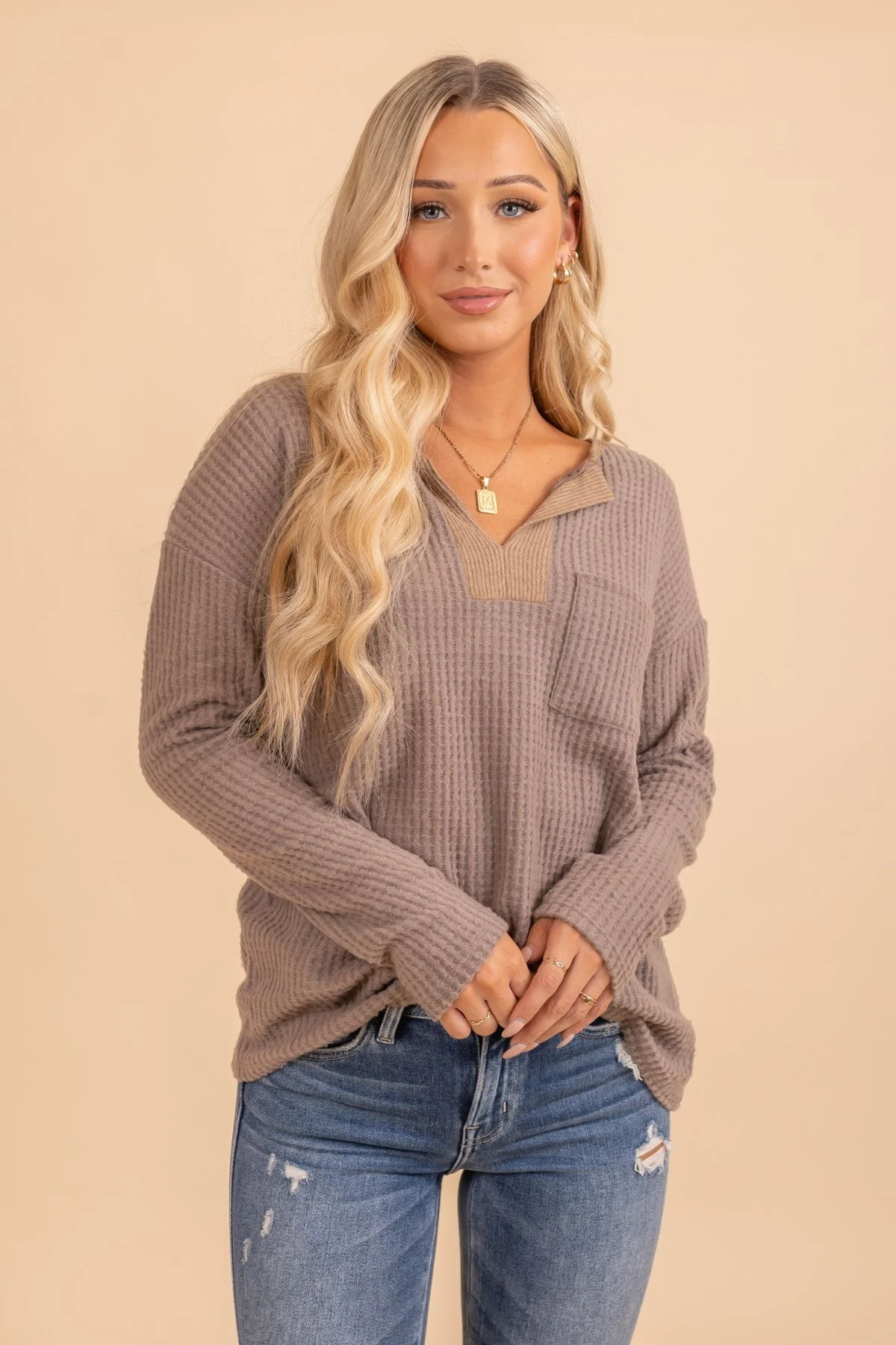 Our New In The Now Waffle Knit Long Sleeve Top is such a cute cozy top! We’re in love with the super soft waffle knit material, v-neckline, and the different shades of brown! This top is so soft and comfortable for an everyday wear!