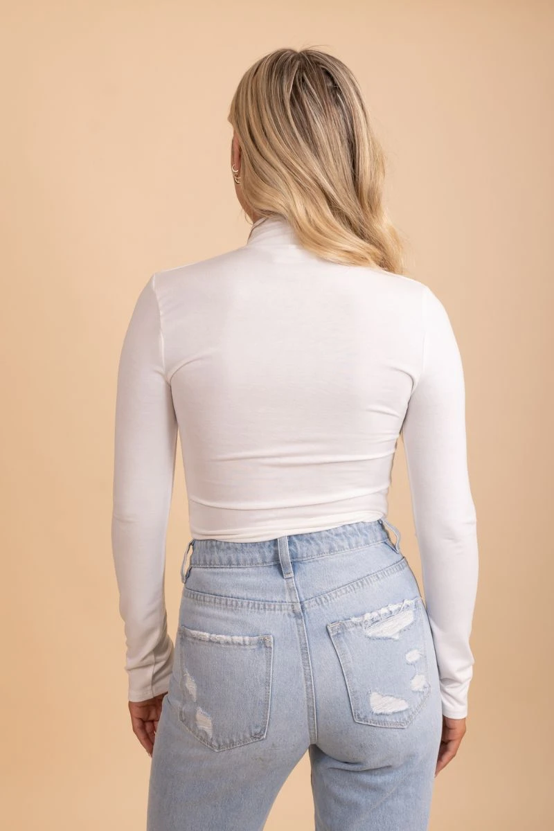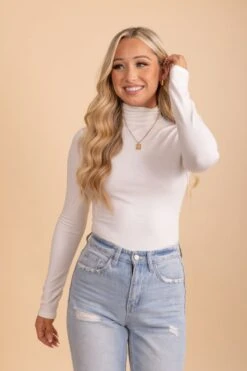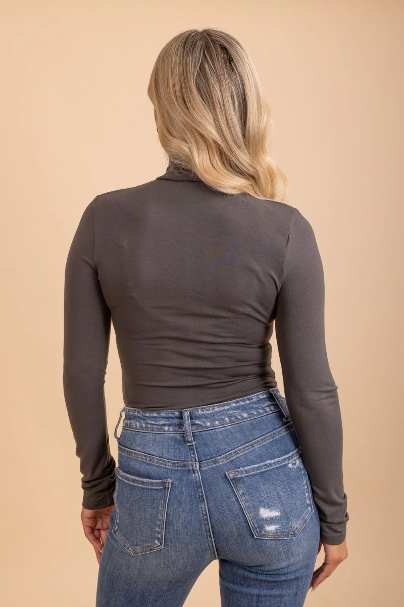 Our Keep It Fierce Long Sleeve Turtleneck Bodysuit is must have! This bodysuit features long sleeves and a high rise turtleneck. It is form fitting and is very flattering! It also comes in the softest material that will keep you cute and cozy all day long!