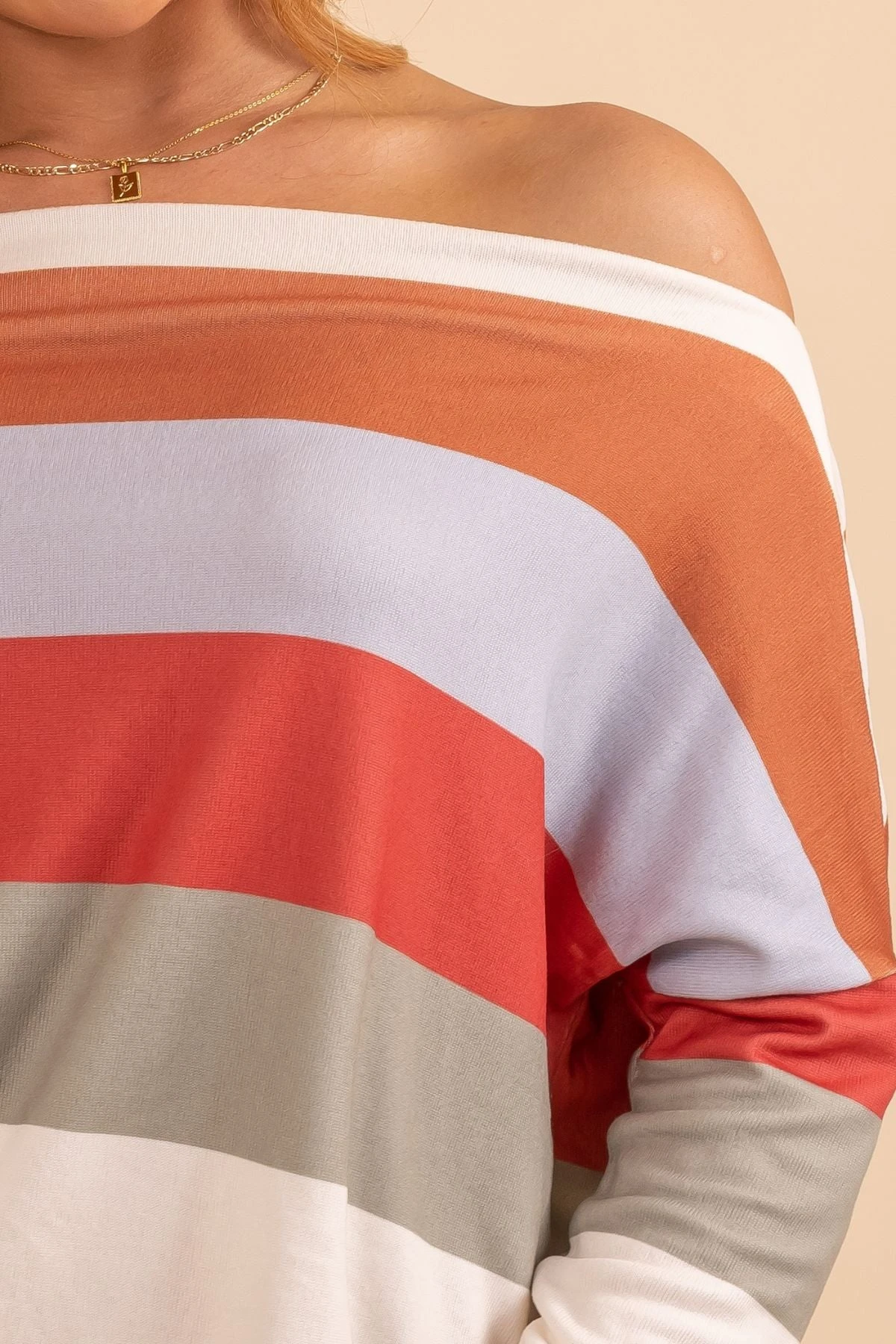 Our new Living Loud Striped Wide Neck Top is the cutest statement piece! This cute top features different fall colored stripes, long sleeves, and a comfy relaxed fit. The wide neckline allows you to wear this top on one shoulder or off both shoulders making it so fun to wear!