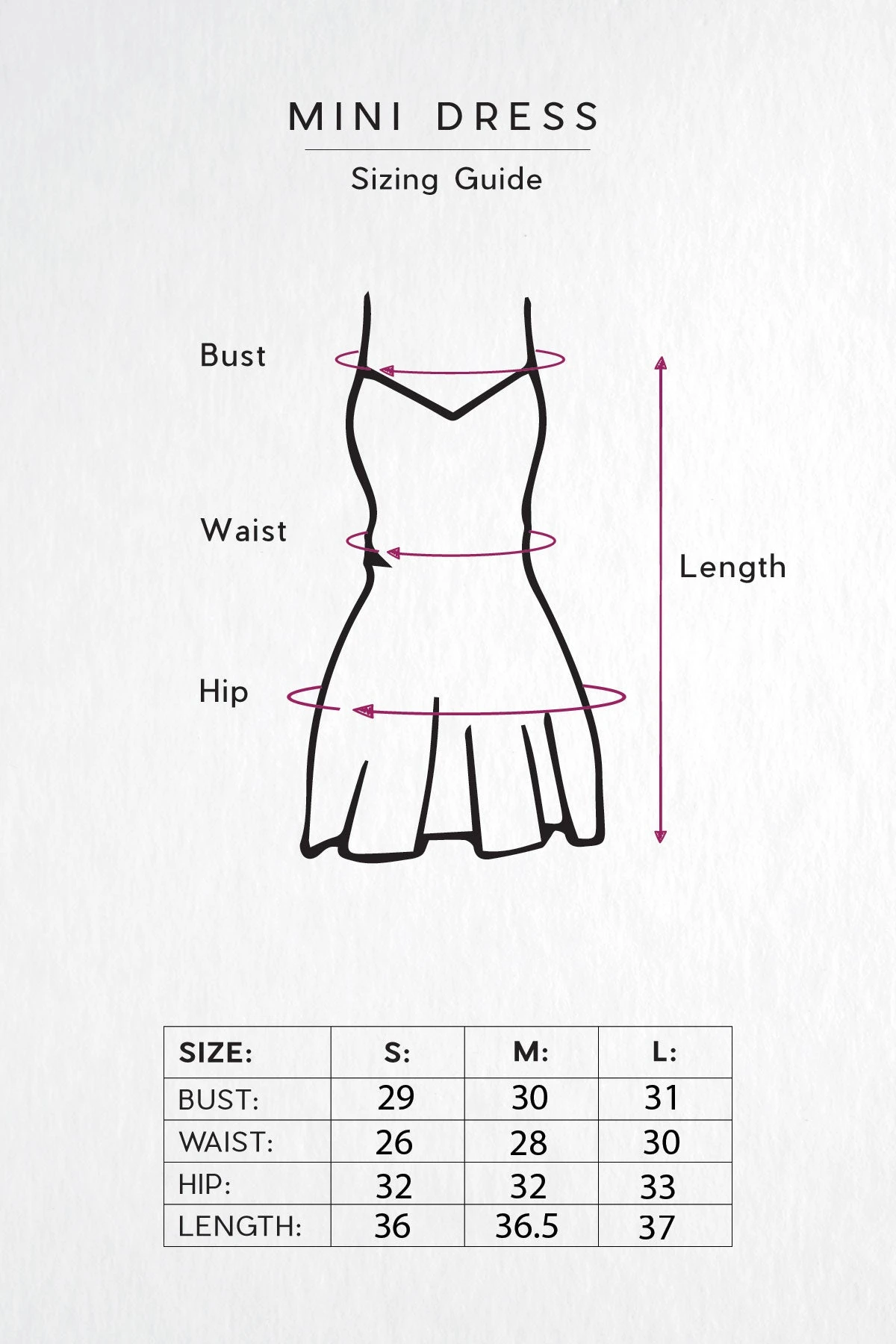 Measurements: US Size Bust Waist Hip Length Sleeve S 0-4 29″ 26″ 32″ 36″ 3″ M 8-6 30″ 28″ 32″ 36.5″ 3″ L 10-12 31″ 30″ 33″ 37″ 3″ For more information on how to choose the perfect size, check out our size guide.