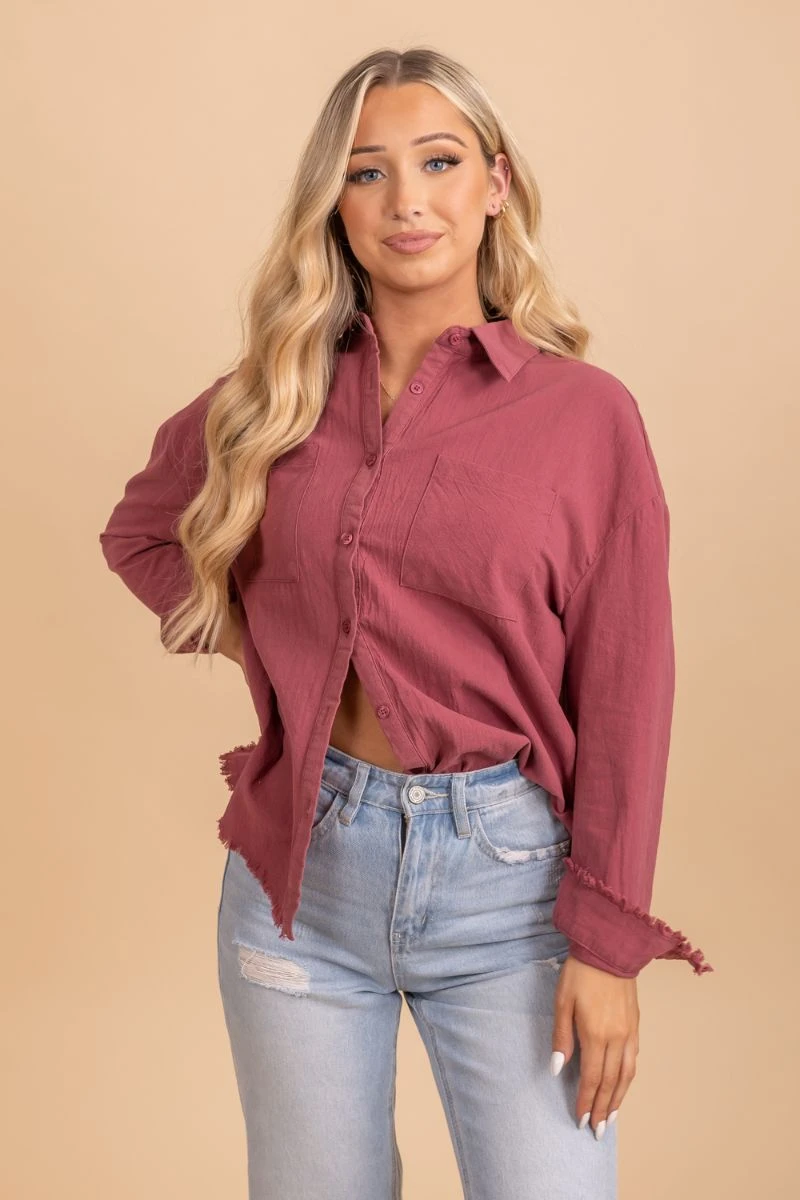 Our Make It Yours Button Up Top is what your wardrobe needs for the upcoming seasons! This top is the cutest dark pink color and has the cutest details from the buttons to the most flattering comfortable fit!