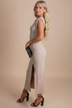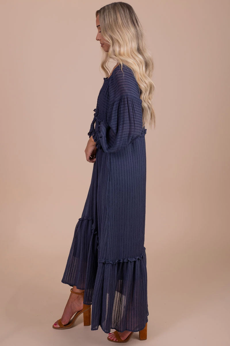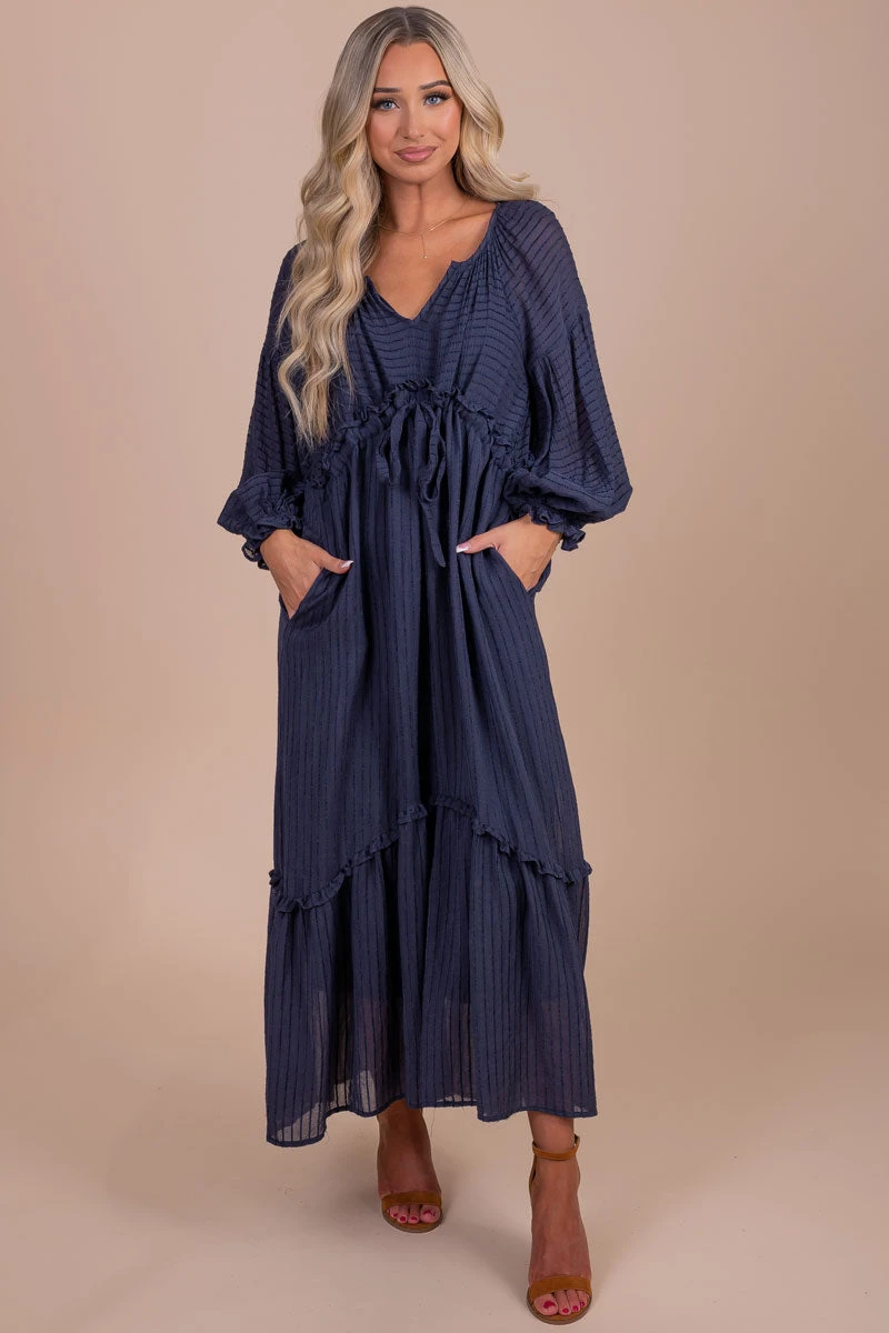 Our new My Favorite Hello Long Sleeve Maxi Dress is the cutest dress for this upcoming chilly weather! We’re so in love with the maxi length, tiered details, and love bubble sleeves! The two color options, v-neckline, and textured striped details work together to make this the perfect fall dress! Pair your My Favorite Hello Long Sleeve Maxi Dress with your favorite platform boots to create a trendy and fun fall outfit!