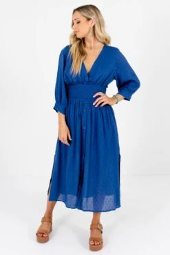 You’ll look darling in our new My Muse Blue Midi Dress! This gorgeous dress is a solid blue color. It features a faux wrap v-neckline, polka dot textured material, and partial lining. You’ll love the smocked waistband, 3/4 length sleeves, and button-up skirt! The hem slits add a flirty finishing touch. Pair the My Muse Blue Midi Dress with heeled sandals for a lovely outfit!Â