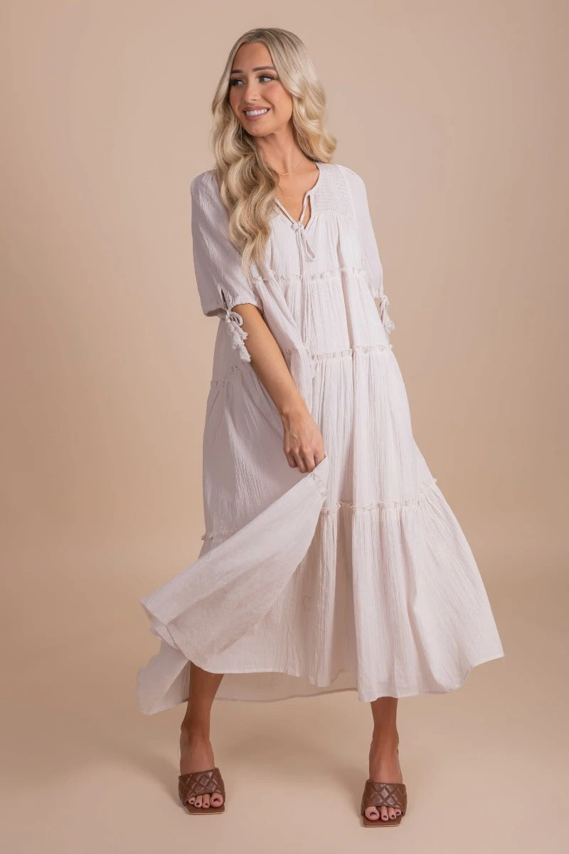Our One Day at a Time Maxi Dress gives off major bohemian vibes! This maxi-length dress features high-quality material and an interior lining that makes it so comfortable to wear. You’ll fall in love with the smocked accents, tassel ties, and ruffled detailing! Pair our One Day at a Time Maxi Dress with heeled sandals to recreate our model’s beautiful outfit.