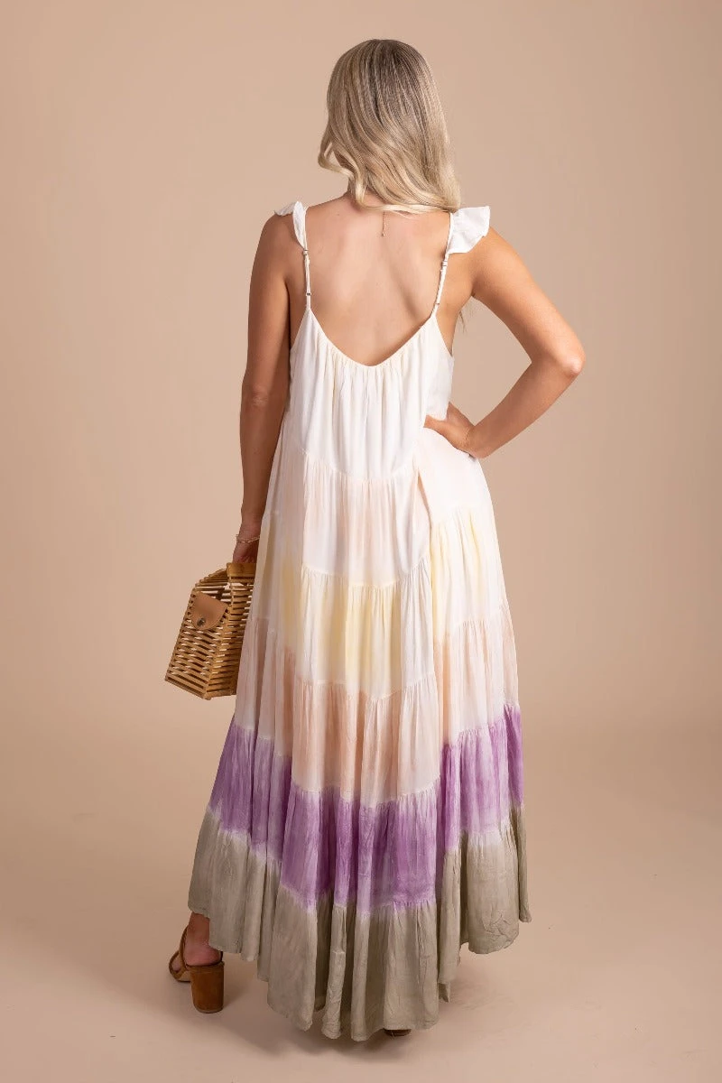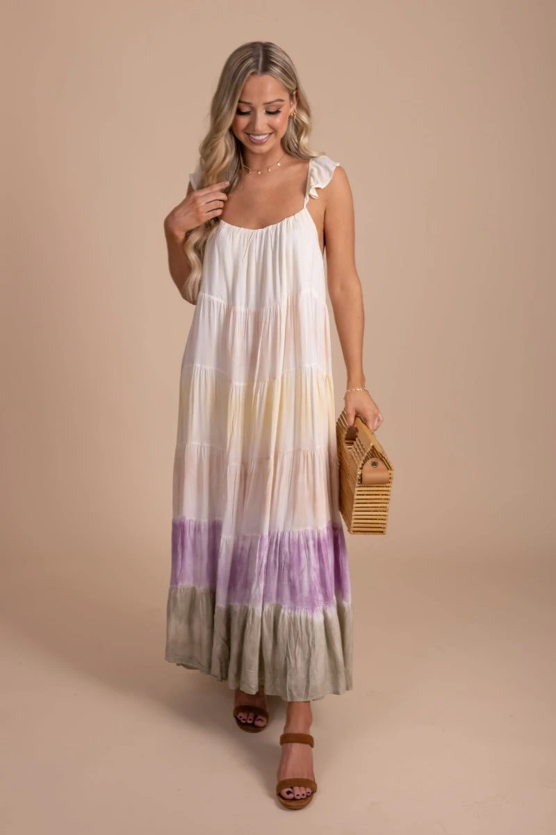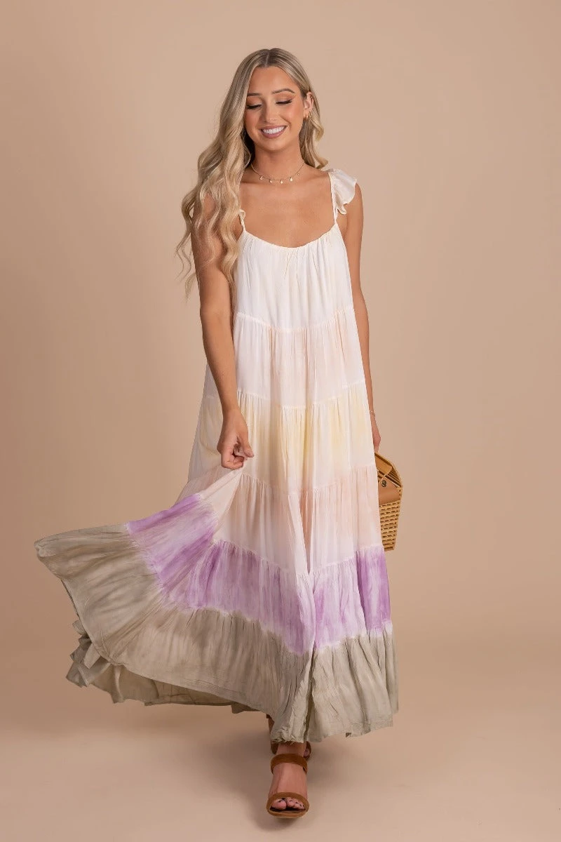 Pair our Painted Sunset Tie Dye Maxi Dress with your favorite platform sandals to create a cute spring/summer outfit! This would be a perfect picnic dress or everyday Spring dress.