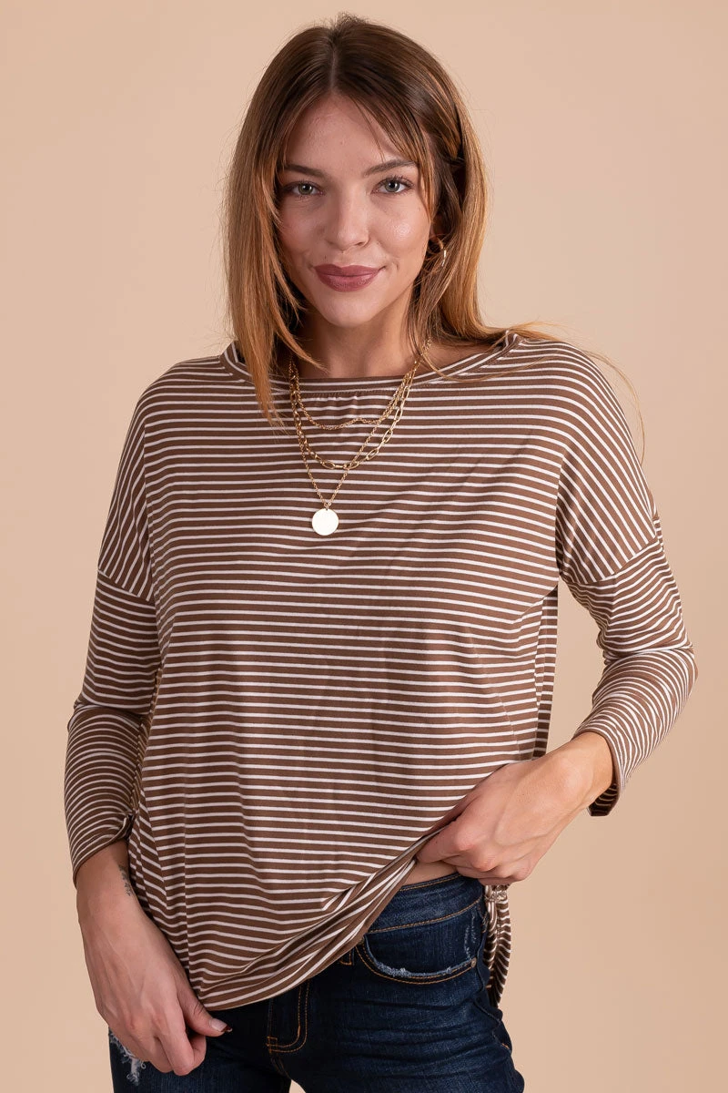 Our Playing For Keeps Striped Long Sleeve Top is so cute! This top features three color options, a striped pattern, and soft, stretchy material! The high-low hem and round neckline make it comfortable and flattering! Pair your Playing For Keeps Striped Long Sleeve Top with your favorite jeans to create a cute yet simple outfit.