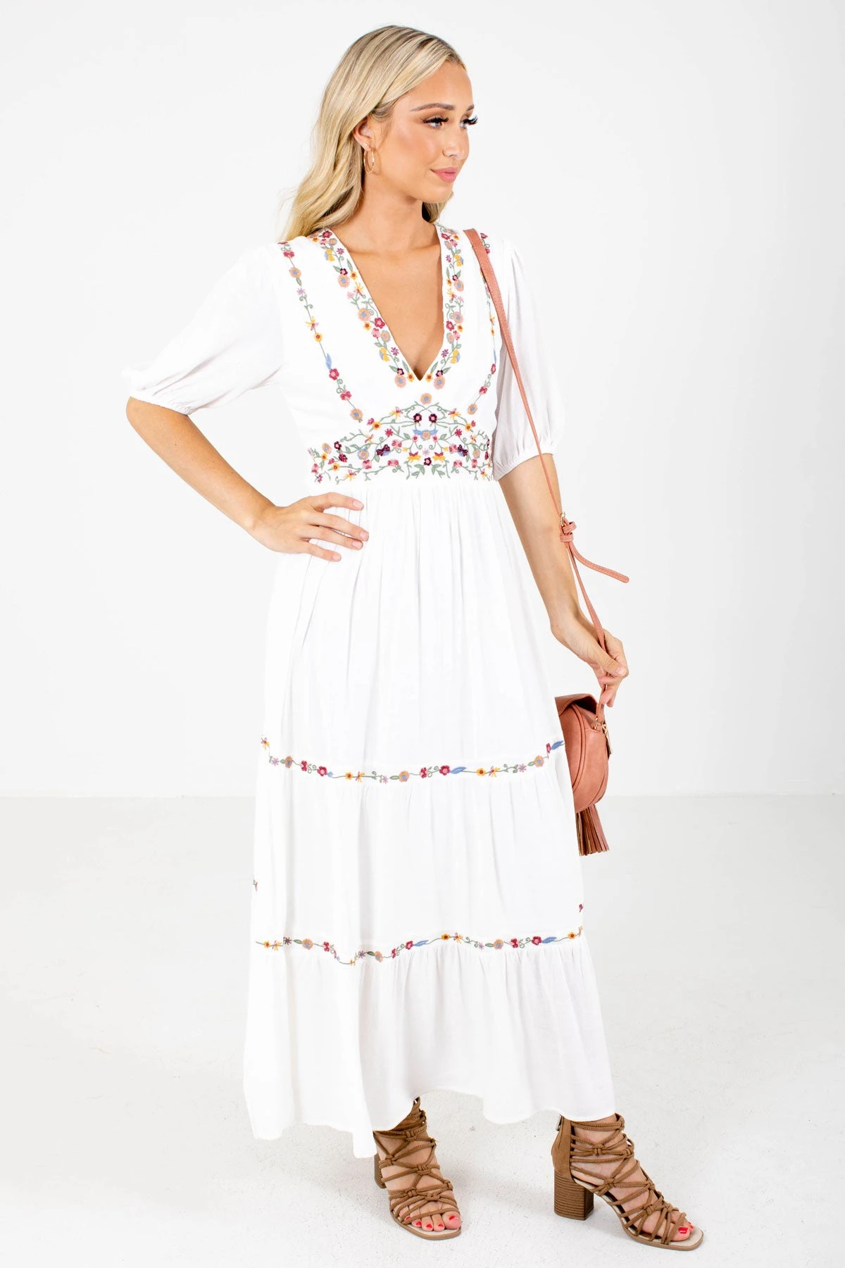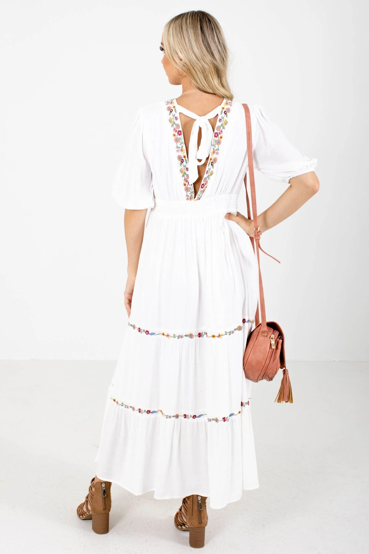 Our new Queen of Summer White Maxi Dress is so beautiful! This maxi length dress is white and features gorgeous multicolored floral embroidered detailing. We’re in love with the open back, that’s complete with a self-tie accent! The back elastic waistband, full lining, and high-quality material work together to make this dress comfortable an easy to wear. Pair our Queen of Summer White Maxi Dress with your favorite heeled sandals!