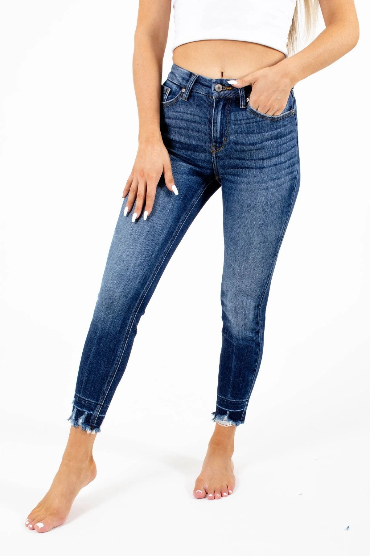 Our Say Yes KanCan Skinny Jeans are a must-have for your closet! These dark blue jeans feature a button-up and zipper fly and distressed hem detailing. We love how they are so versatile. Wear them with all of your favorite tops and sweaters.