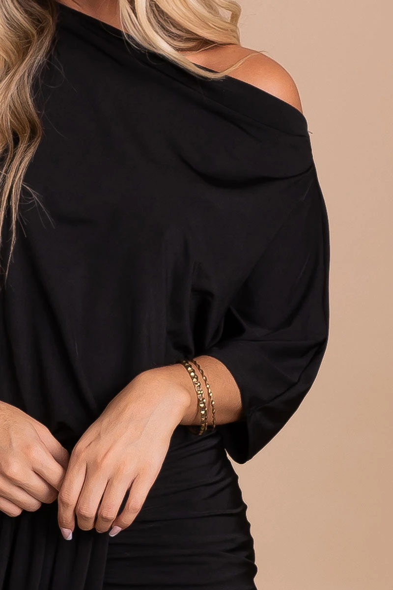 Our Show Off One-Shoulder Midi Dress will quickly become your new favorite dress-up piece! The solid black color, silky soft material, and one-shoulder accent make this dress comfortable and stunning! The mid-thigh length slit in the front adds the perfect finishing touch!