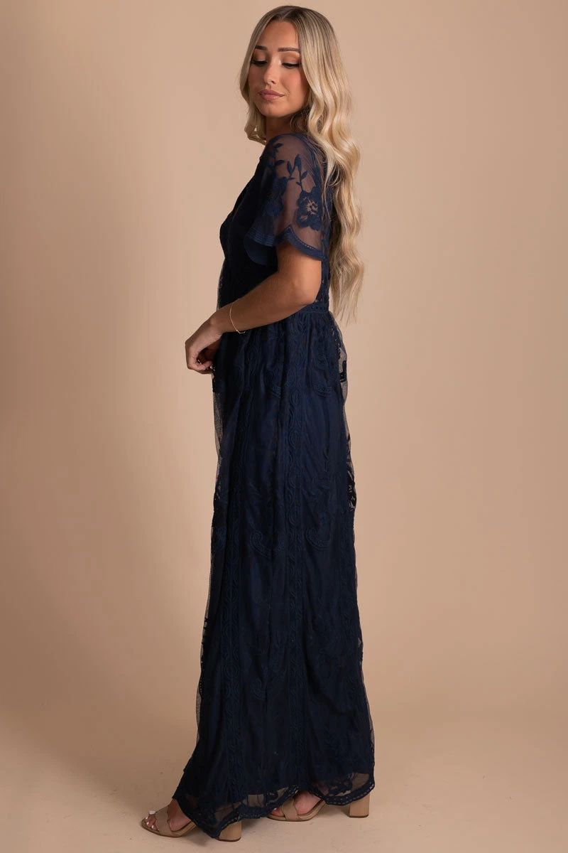 Our Simple Serenity Lace Maxi Dress would be so stunning for your next special occasion. We’re in love with the trendy navy blue color, making this dress perfect for any season! The v-neckline, long maxi length, and gorgeous lace details make this dress so stunning! The lightweight, high-quality material creates a comfortable and flattering silhouette. Pair our Simple Serenity Lace Maxi Dress with your favorite heels to create a beautiful outfit!