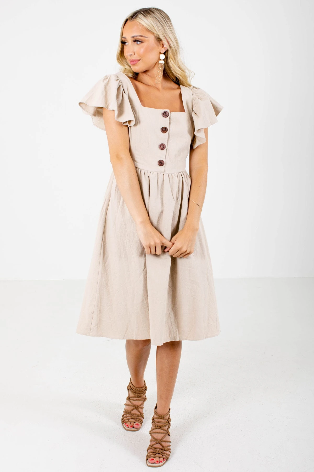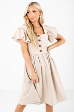 Our Smooth Sailing Taupe Knee-Length Dress will quickly become your new favorite piece! This knee-length dress is a solid taupe brown color. It features a button-up bodice, waist tie detail, and flutter style sleeves! The high-quality material and interior lining work together to make this dress comfortable and easy to wear. Pair our Smooth Sailing Taupe Knee-Length Dress with your favorite heeled sandals!