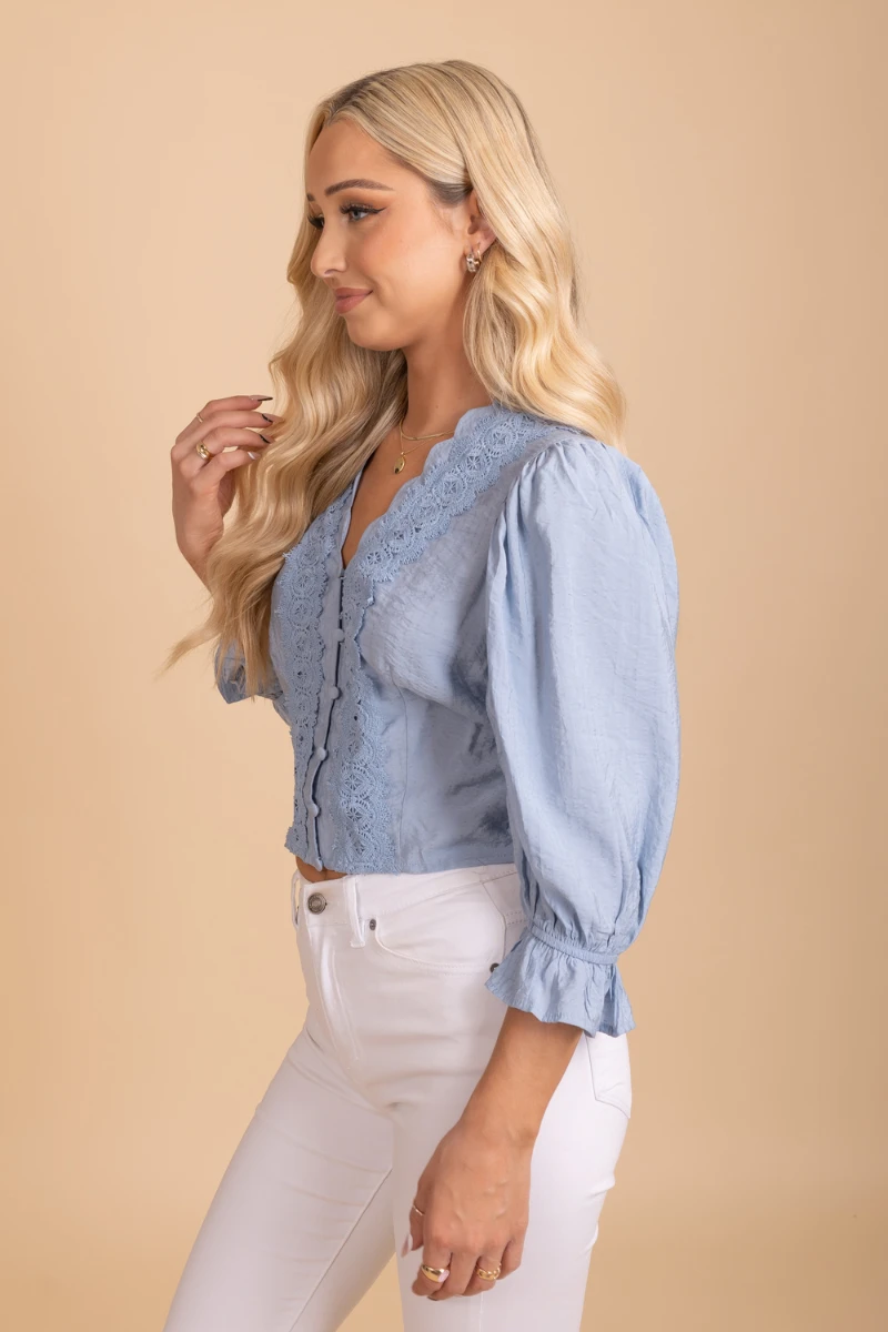 Our Step Aside Puff Sleeve Top! This cute top comes in a beautiful blue color. It features a v-neckline, puff sleeves, lace detailing, and a button-down front. Our favorite part is the cute lace detail paired with the puff sleeves! The flattering fit adds the perfect finishing touch. The Step Aside Puff Sleeve Top is perfect for a photoshoot and date night.