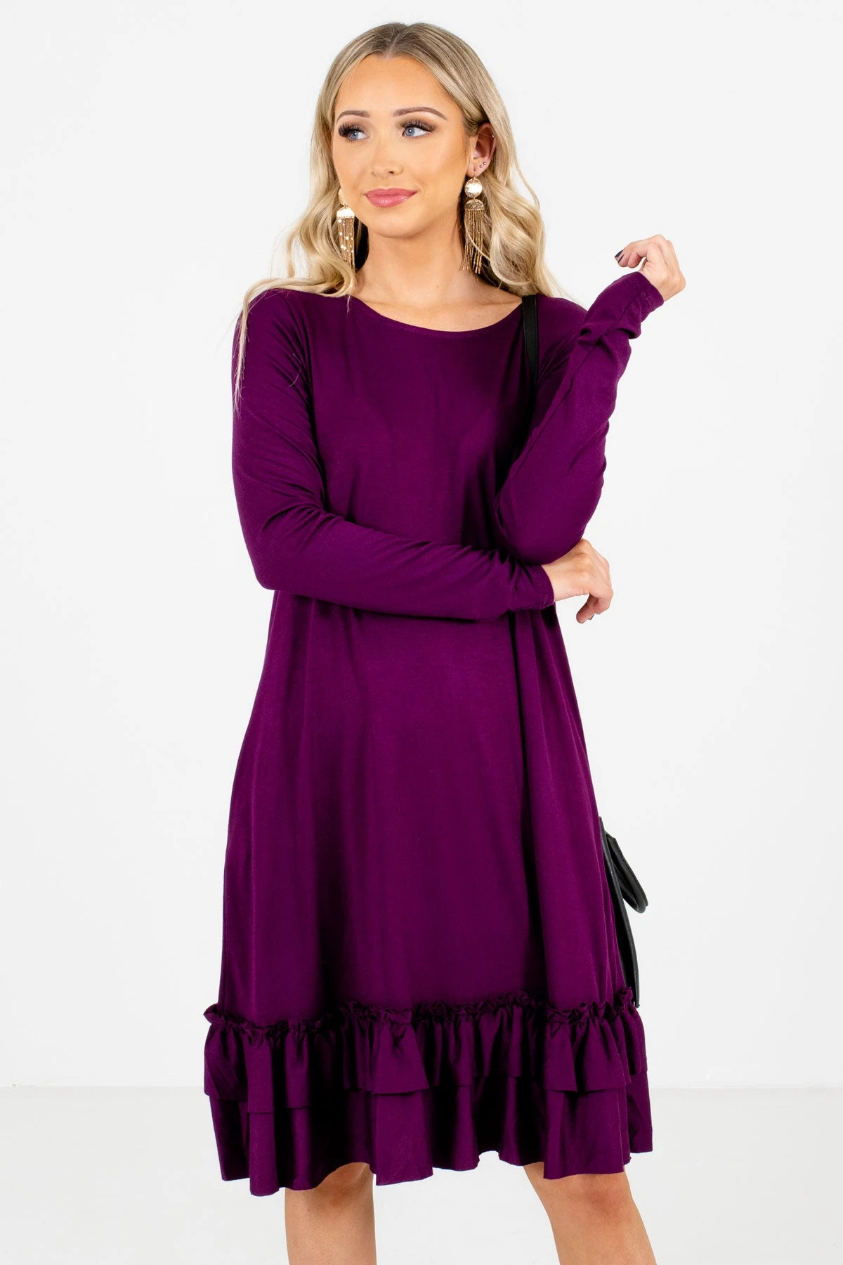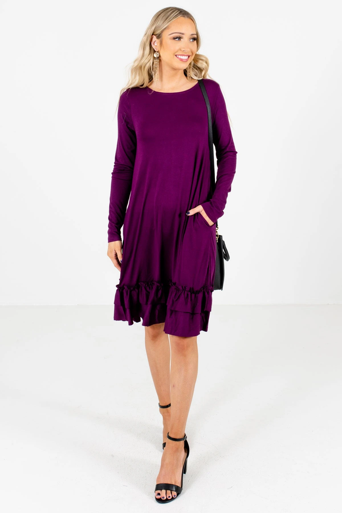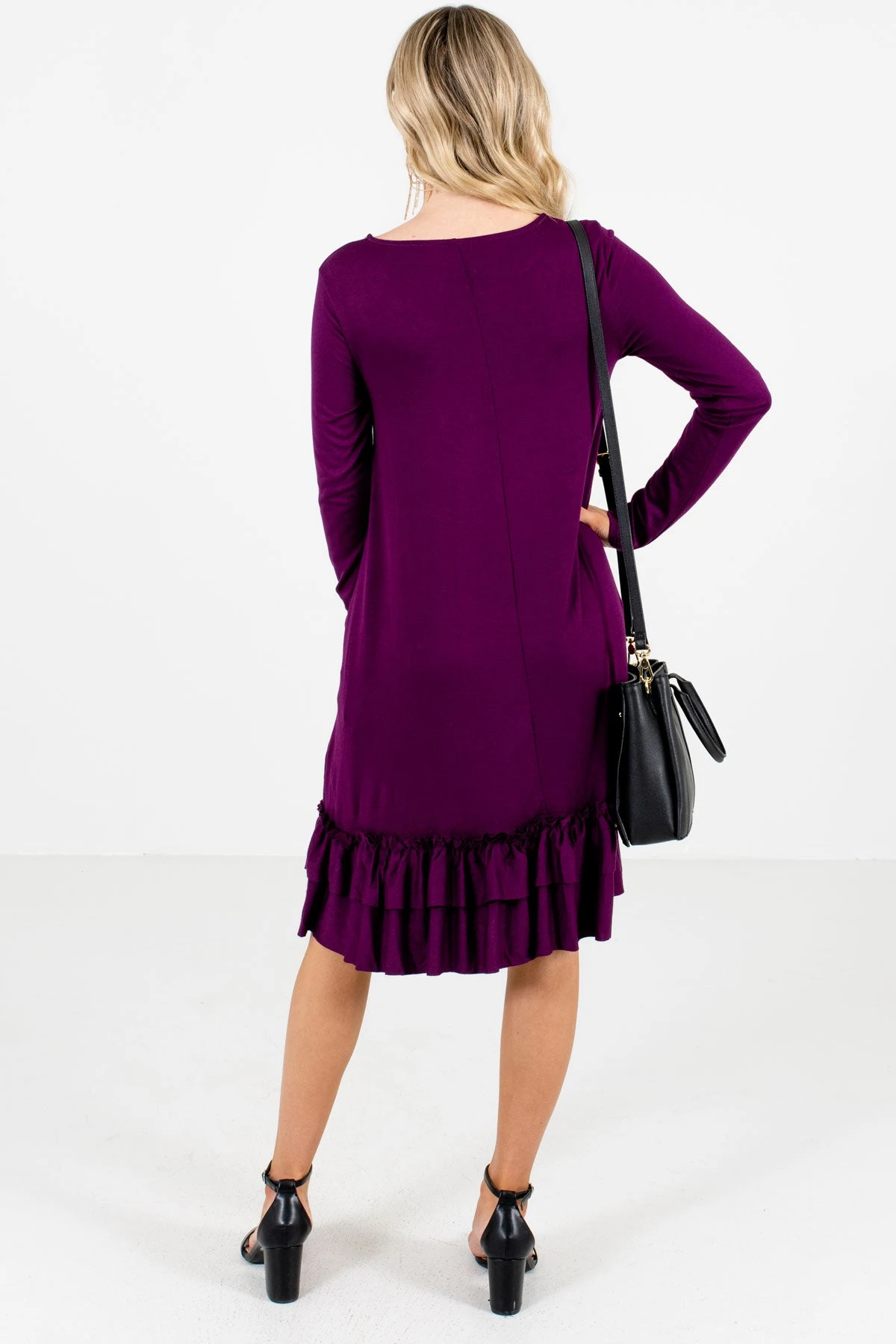 Our new Tea Time Purple Knee-Length Dress is so fun and wearable! This knee-length dress is a solid plum purple color. It features a round neckline, long sleeves, and an adorable ruffled hem! We’re in love with the high-quality material that’s perfect for the upcoming season. The pockets add the perfect finishing touch! Pair our Tea Time Purple Knee-Length Dress with sleek black heels and a matching bag to recreate our model’s gorgeous outfit!