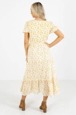 Our When Morning Comes Orange Midi Dress is composed of 100% Rayon; 100% Polyester Lining. Hand wash cold. Hang or lay flat to dry. Please do not bleach.
