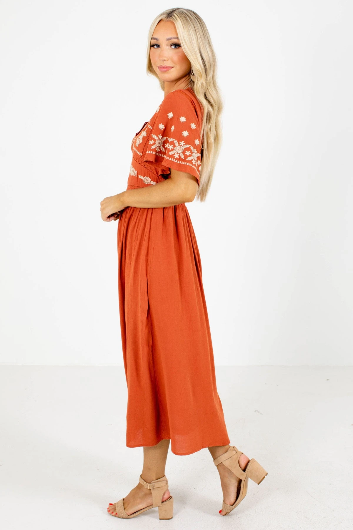 You’ll look and feel ready for fall in our new When Morning Comes Orange Midi Dress! This adorable dress features beautiful rust orange color. We’re in love with the beige floral embroidery throughout the bodice! The v-neckline, keyhole back, and interior lining add the perfect finishing touches. Pair our When Morning Comes Orange Midi Dress with your favorite heels!