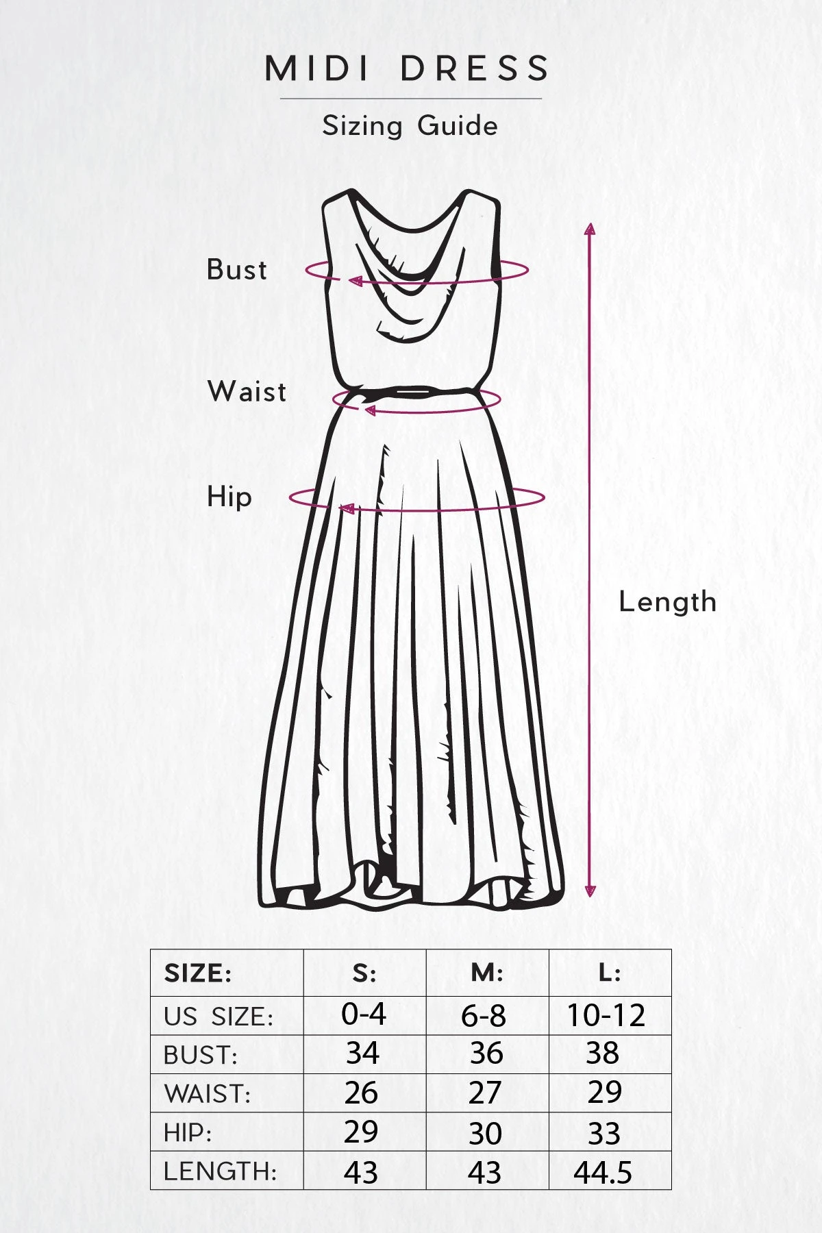 Measurements: US Size Bust Waist Hip Length Sleeve S 0-4 34″ 26″ 29″ 43″ 9.5″ M 6-8 36″ 27″ 30″ 43″ 9.5″ L 10-12 38″ 29″ 33″ 44.5″ 9.5″ For more information on how to choose the perfect size, check out our size guide.